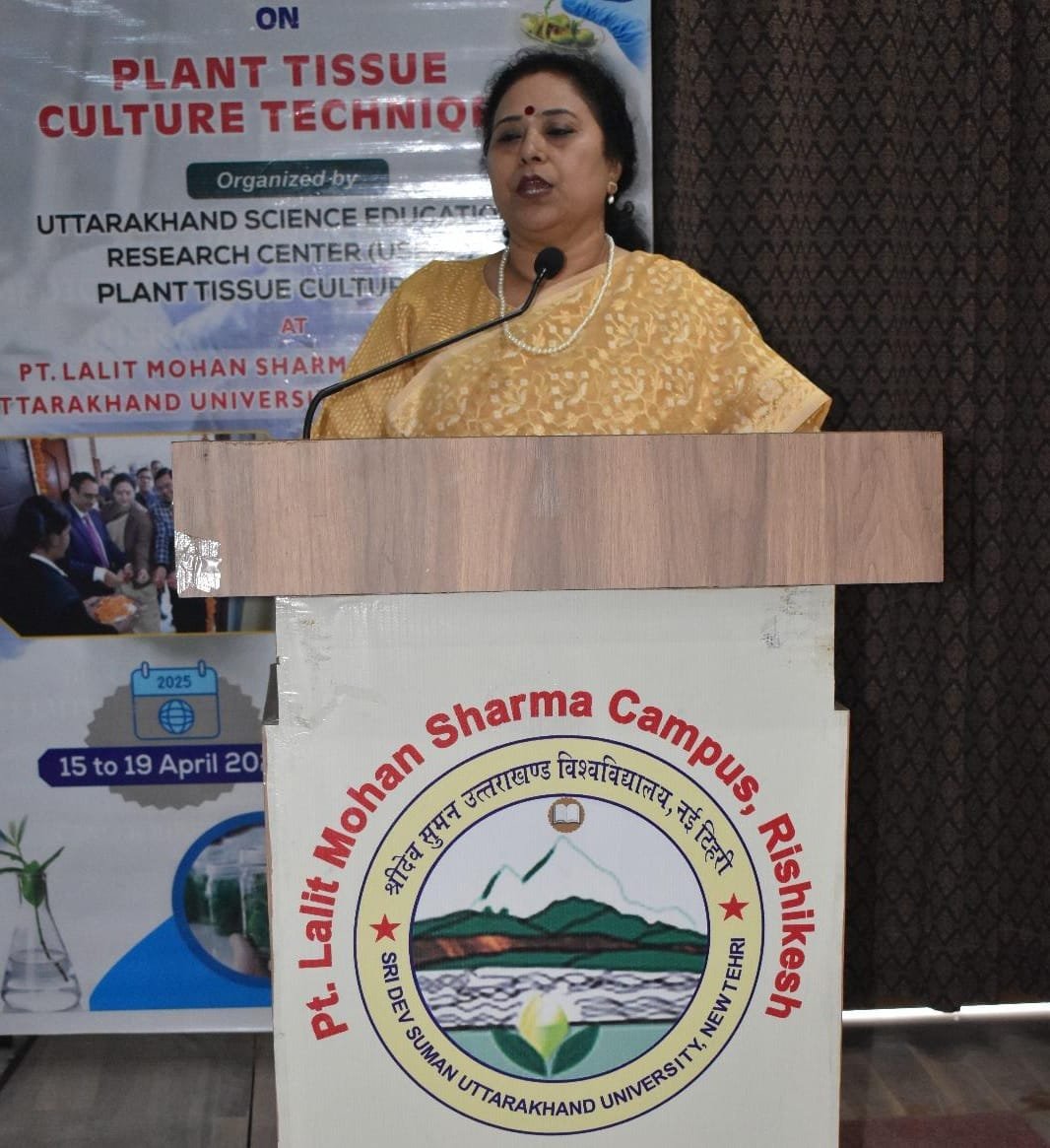 कार्यशाला में मुख्य अतिथि यूसर्क की निदेशक प्रो.(डॉ) अनीता रावत ने कहा कि यूसर्क उद्यमिता विकास केंद्र के द्वारा यह 72वीं कार्यशाला का आयोजन किया जा रहा है जिसमें यूसर्क का उद्देश्य विज्ञान शिक्षा का प्रचार प्रसार करना है, जिसमें लगातार पर्वतीय क्षेत्र के छात्र-छात्राओं को अत्याधुनिक प्रयोशालाओं में प्रशिक्षण प्रदान किया जा रहा है, इसी प्रकार स्कूल स्तर पर भी छात्र-छात्राओं को विज्ञान शिक्षा के प्रति प्रेरित किया जा रहा है। इसी प्रकार इस पादप उत्तक संवर्धन तकनीकी कार्यशाला से प्रतिभागी उद्यमिता की ओर अग्रसर होकर से अपनी आय सृजन कर सकते हैं। इस क्षेत्र में रोजगार की अनेको संभावना हैI