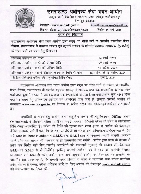उत्तराखण्ड अधीनस्थ सेवा चयन आयोग द्वारा समूह ‘ग’ सीधी भर्ती के माध्यम से माध्यमिक शिक्षा विभाग, उत्तराखण्ड के अंतर्गत गढ़वाल मण्डल में सहायक अध्यापक (LT) के 786 रिक्त पदों तथा कुमाऊँ मण्डल में सहायक अध्यापक (LT) के 758 रिक्त पदों अर्थात कुल 1544 रिक्त पदों पर चयन हेतु ऑनलाइन आवेदन पत्र आमन्त्रित किए जाते हैं। इच्छुक अभ्यर्थी आयोग की वेबसाइट www.sssc.uk.gov.in पर दिनांक 12 अप्रैल, 2024 तक ऑनलाइन आवेदन कर सकते हैं।