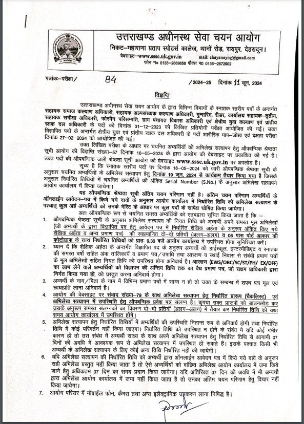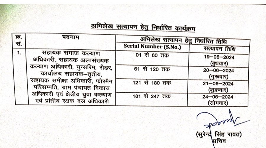 उक्त लिखित परीक्षा के आधार पर चयनित अभ्यर्थियों की अभिलेख सत्यापन हेतु औपबन्धिक श्रेष्ठता सूची आयोग की विज्ञप्ति संख्या-57 दिनांक 16-05-2024 के द्वारा आयोग की वेबसाइट पर प्रकाशित की गई है। उक्त पदों की औपबन्धिक जारी श्रेष्ठता सूची आयोग की वेबसाइट www.sssc.uk.gov.in पर अपलोड है। सूच्य है कि स्नातक स्तरीय पदों पर जारी औपबन्धिक श्रेष्ठता सूची के अनुसार चयनित अभ्यर्थियों के अभिलेख सत्यापन हेतु दिनांक 19 जून, 2024 से कार्यक्रम तैयार किया गया है जिसके अनुसार निर्धारित तिथियों में चयनित अभ्यर्थियों की अंकित Serial Number (S.No.) के अनुसार अभिलेख सत्यापन आयोग कार्यालय में किया जायेगा।