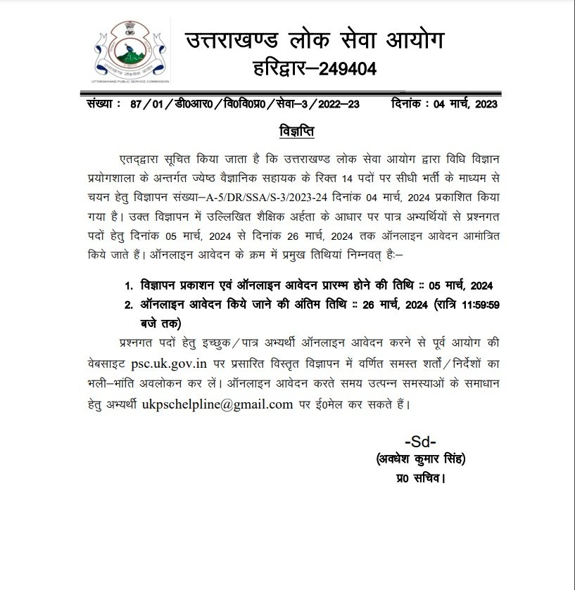 हरिद्वार : उत्तराखंड लोक सेवा आयोग (UKPSC) विधि विज्ञान प्रयोगशाला में सीनियर वैज्ञानिक सहायक की भर्ती निकली है। भर्ती के लिए आज से आवेदन शुरू हो गए हैं। इसके तहत 14 पदों पर दीदही भर्ती की जाएगी। आवेदन करने की अंतिम तिथि 26 मार्च तय की गई है।