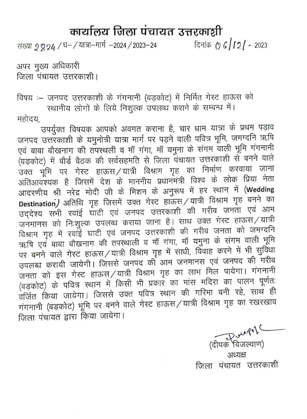 जिला पंचायत अध्यक्ष का कहना है कि चार धाम यात्रा के प्रथम पड़ाव जनपद उत्तरकाशी के यमुनोत्री यात्रा मार्ग पर पड़ने वाली पवित्र भूमि, जमग्दनि ऋषि एवं बाबा बौखनाग की तपस्थली व मां गंगा और यमुना के संगम वाली भूमि गंगनानी (बड़कोट) में बोर्ड बैठक की सर्वसहमति से जिला पंचायत उत्तरकाशी से बनने वाले उक्त भूमि पर गेस्ट हाऊस/यात्री विश्राम गृह का निर्माण करवाया जाना अतिआवश्यक है। जिसमें प्रधानमंत्री विश्व के लोक प्रिय नेता नरेंद्र मोदी के मिशन के अनुरूप में हर स्थान में (Wedding Destination) अतिथि गृह, जिसमें उक्त गेस्ट हाऊस / यात्री विश्राम गृह बनने का उद्देश्य सभी रवांई घाटी एवं जनपद उत्तरकाशी की गरीब जनता एवं आम जनमानस को निःशुल्क उपलब्ध कराया जाना है।