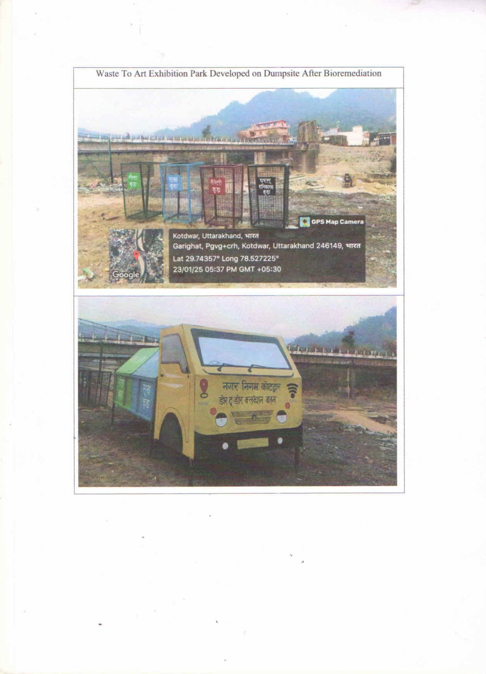 नगर निगम द्वारा लगभग 1.0 हेक्टेयर भूमि पर स्थित डंप साइट से कुल 31449 मीट्रिक टन पुराने कूड़े का निपटान किया गया है (प्रथम चरण में लगभग 26350 मीट्रिक टन और द्वितीय चरण में 5099 मीट्रिक टन)। इस reclaimed भूमि में से 0.9 हेक्टेयर पर विंडरोव्स कंपोस्टिंग एवं एमआरएफ प्लांट बनाया गया है, जबकि 0.1 हेक्टेयर भूमि को ‘वेस्ट टू आर्ट प्रदर्शनी पार्क’ में बदल दिया गया है। यह पार्क ठोस अपशिष्ट प्रबंधन के प्रति जागरूकता बढ़ाने के लिए बनाया गया है, जहाँ कूड़े के प्रकार, वेस्ट कलेक्शन व्हीकल, प्लास्टिक के प्रकार, कंपोस्टिंग मॉडल, इको बेंच, इको घड़ी, कंपोस्टिंग पिट मॉडल एवं ट्रॉमेल मशीन मॉडल जैसे विभिन्न मॉडल प्रदर्शित किए गए हैं।