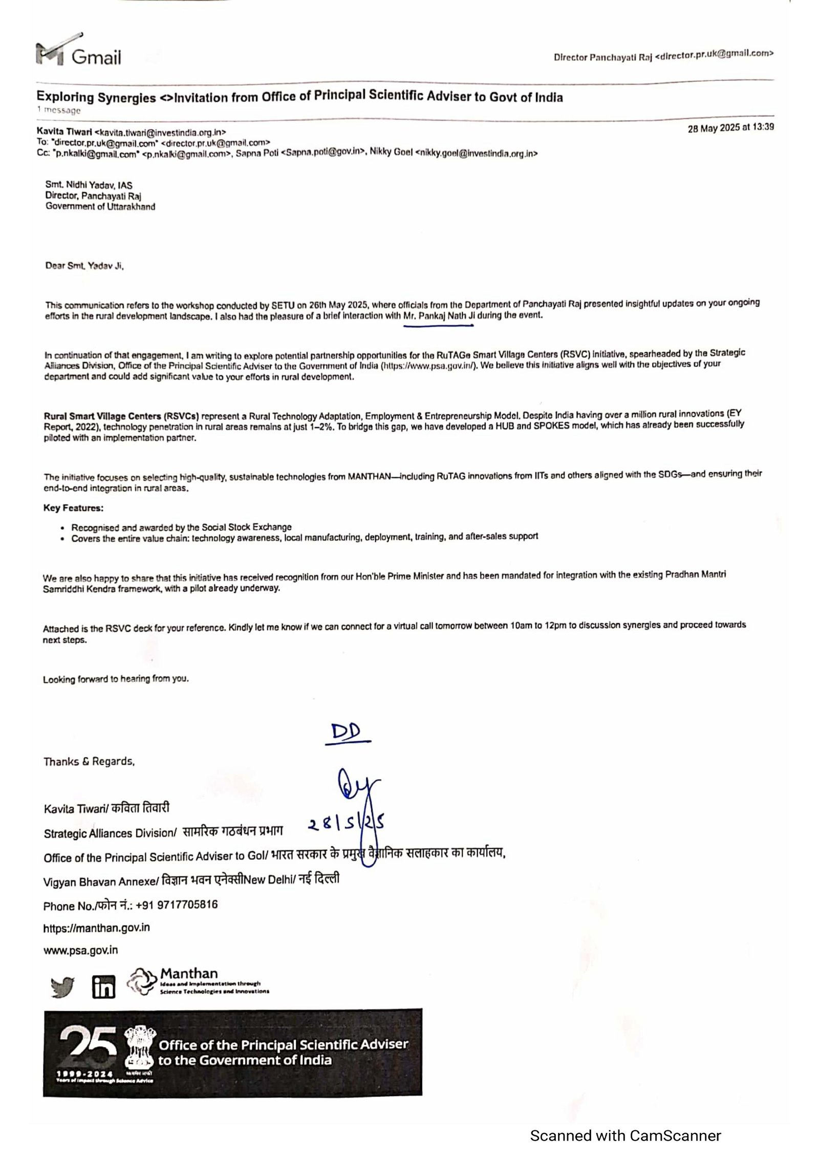 हाल ही में, सेतु आयोग के तत्वावधान में UPES कंडोली में प्रिंसिपल साइंटिफिक एडवाइजर ऑफ इंडिया (PSA), जो प्रधानमंत्री कार्यालय के लिए कार्य करता है, द्वारा स्मार्ट विलेज सेंटर की अवधारणा पर एक कार्यशाला आयोजित की गई थी। इस कार्यशाला में निदेशक पंचायती राज निधि यादव द्वारा भेजी गई टीम ने पंचायती राज विभाग द्वारा निर्मित 39 पंचायत लर्निंग सेंटर, वर्तमान वर्ष में बनने वाली 13 महिला हितैषी ग्राम पंचायतें और पंचायत एडवांसमेंट इंडेक्स (PAI) में सभी 9 थीमेटिक विषयों में सर्वोच्च रैंकिंग प्राप्त 27 ग्राम पंचायतों सहित कुल 79 ग्राम पंचायतों में केंद्र सरकार और राज्य सरकार की सभी योजनाओं को शत प्रतिशत संतृप्तिकरण के आधार पर क्रियान्वित करने के लिए एक विस्तृत रणनीतिक कार्ययोजना प्रस्तुत की।