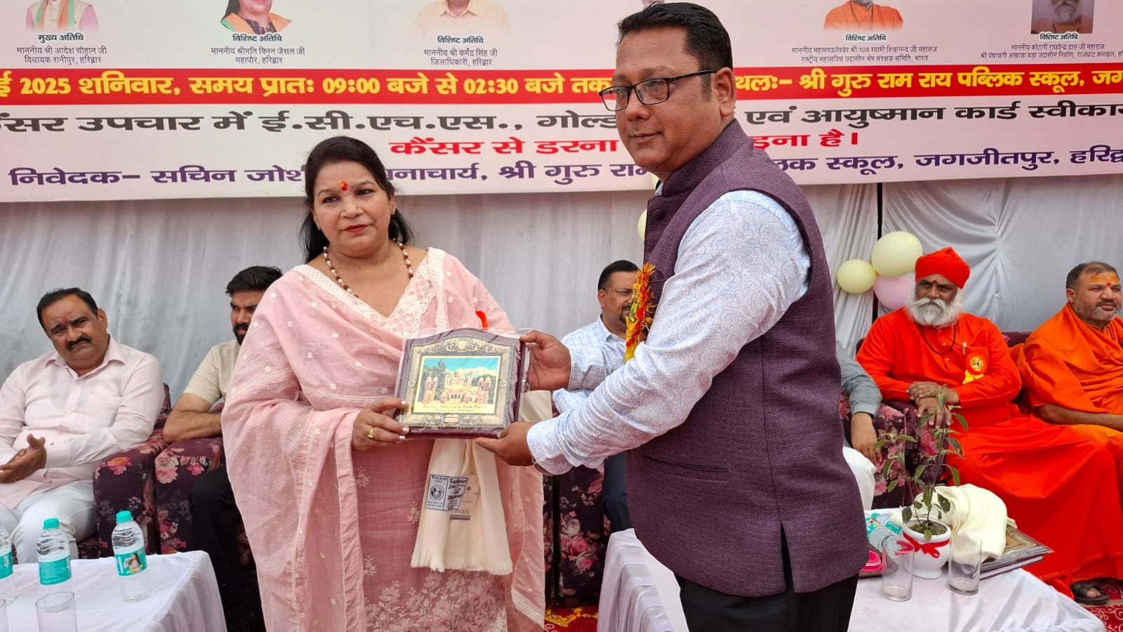 मुख्य अतिथि आदेश चौहान ने कहा कि शिक्षा और स्वास्थ्य दोनों ही आम आदमी के जीवन से जुड़े महत्वपूर्णं विषय हैं। श्री महंत इन्दिरेश अस्पताल, देहरादून की ओर से स्वास्थ्य सेवाओं में जो कार्य किए जा रहे हैं वे सराहनीय हैं। उन्होंने कहा कि श्री महंत इन्दिरेश अस्पताल, देहरादून ने हरिद्वार क्षेत्र में कैंप आयोजित कर क्षेत्रवासियों को कैंसर जागरूकता के बारे में महत्वपूर्णं जानकारियां सांझा की और आमजन के लिए कैंप लगाया। इसके लिए उन्होंने श्री महंत इन्दिरेश अस्पताल के चेयरमैन श्रीमहंत देवेन्द्र दास जी महाराज का विशेष रूप से आभार व्यक्त किया। उन्होंने अस्पताल प्रबन्धन से आग्रह किया कि भविष्य में भी हरिद्वार में इस प्रकार के निःशुल्क स्वास्थ्य शिविर आयोजित किए जाएं। उन्होंने सी बी एस ई परीक्षा में उत्कर्षत प्रदर्शन करने वाले एस जी आर आर स्कूल के बच्चों को बधाई दी. उन्होंने कहा कि शिक्षा के साथ साथ बच्चों को संस्कारवान बनाना भी बहुत जरुरी है. एस जी आर आर एजुकेशन मिशन के स्कूल इस कार्य को बखूबी निभा रहे हैँ. इस कार्य के लिए उन्होंने मिशन के चेयरमेन श्रीमहंत देवेंद्र दास जी महाराज को बहुत बहुत बधाई दी.