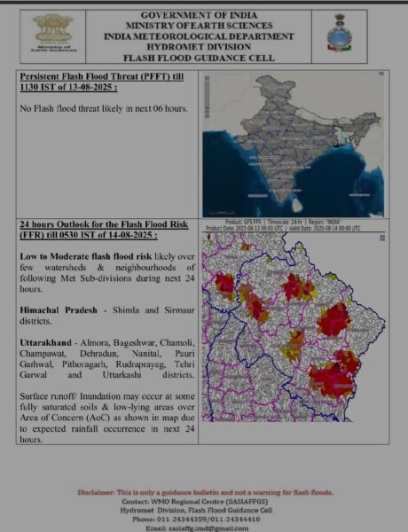देहरादून : भारत मौसम विज्ञान विभाग के पूर्वानुमान के बाद उत्तराखंड राज्य आपातकालीन परिचालन केंद्र (SEOC) ने राज्य के 11 जिलों अल्मोड़ा, बागेश्वर, चमोली, चम्पावत, देहरादून, नैनीताल, पौड़ी गढ़वाल, पिथौरागढ़, रुद्रप्रयाग, टिहरी और उत्तरकाशी में अगले 24 घंटों के भीतर भारी बारिश के चलते कम से मध्यम स्तर की बाढ़ का खतरा जताया है।
