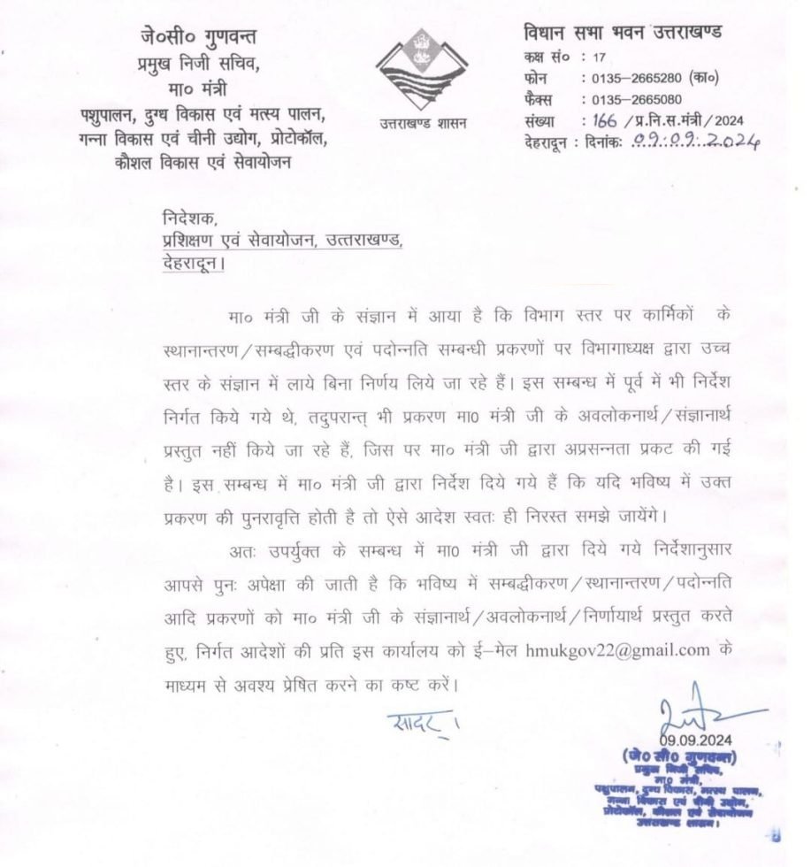 Home » Blog » उत्तराखंड : अधिकारियों की मनमानी, मंत्री पूछे बगैर प्रमोशन, ट्रांसफर और अटैचमेंट, निदेशक को लिखी चिट्ठी