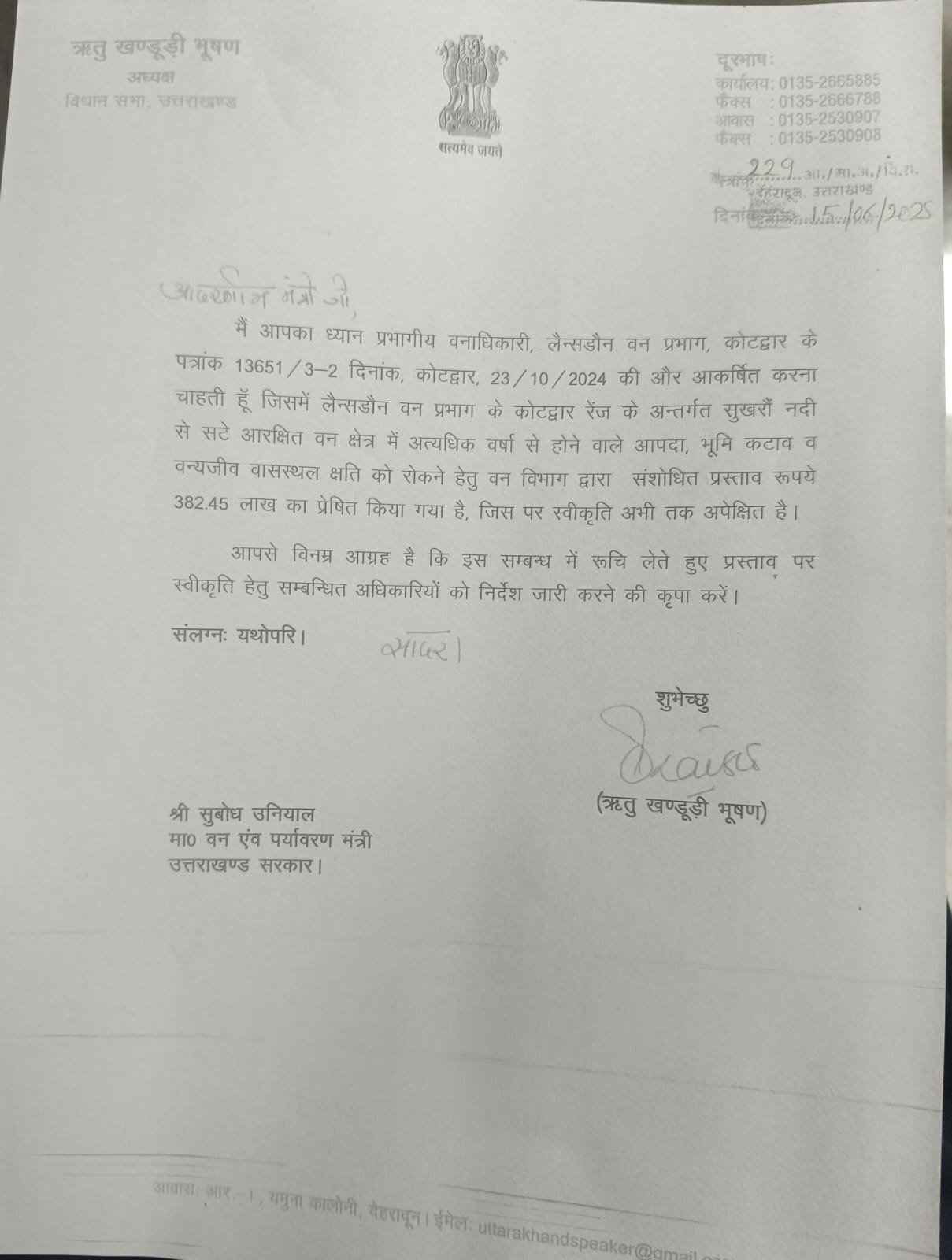 विधानसभा अध्यक्ष ऋतु खण्डूडी भूषण ने वन मंत्री को अवगत कराया कि कोटद्वार विधानसभा क्षेत्र राजाजी नेशनल पार्क और कॉर्बेट नेशनल पार्क के मध्य स्थित है और यह क्षेत्र पाँच प्रमुख नदियों सहित अनेक नालों व संवेदनशील पारिस्थितिकी तंत्र का केंद्र है। उन्होंने विशेष रूप से सुखरो नदी से सटे आरक्षित वन क्षेत्र में भारी वर्षा के कारण उत्पन्न होने वाले भूमि कटाव, आपदा जोखिम और वन्य जीवों के वास स्थल को होने वाली क्षति का उल्लेख किया। इन्हीं बिंदुओं के मद्देनज़र, उन्होंने ₹382.45 लाख की लागत से सुरक्षा दीवार निर्माण का प्रस्ताव वन मंत्री के समक्ष रखा।