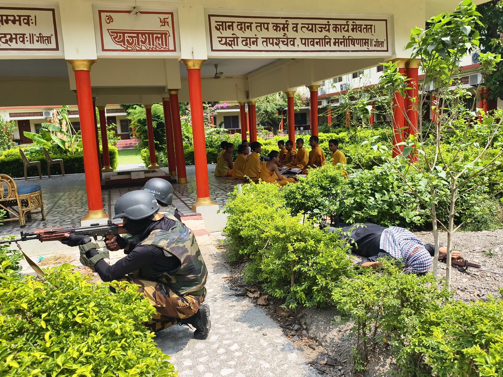 सूचना पर तत्काल ही कार्यवाही करते हुए क्षेत्राधिकारी श्रीनगर अनुज कुमार के नेतृत्व में थाना लक्ष्मणझूला पुलिस की अलग अलग टीमें ओर प्रशासन, मेडिकल फायर,वायरलेस तथा एटीएस ने मिलकर वेदा निकेतन आश्रम में संयुक्त ऑपरेशन चलाया गया जिसमें संयुक्त कार्यवाही करते हुए सभी चारों आतंकवादियों को एटीएस के द्वारा निशाना बनाते हुए जवाबी फायरिंग और भिड़ंत में मार गिराया गया,साथ ही घटना में दो वेदपाठी घायल बच्चों को फर्स्ट एड की टीम के द्वारा स्वास्थ्य लाभ के लिए स्थानीय अस्पताल भेजा गया जिसमें से एक वेद पाठी बालक को हायर सेंटर एम्स रेफर किया गया, वही जवाबी फायरिंग में आश्रम में लगी आग को फायर ब्रिगेड की टीम के द्वारा मौके पर ही बुझा दी गई है ,साथ ही मौके पर प्रशासन की टीम के द्वारा इस घटना में वेद निकेतन आश्रम को हुए सामरिक नुकसान का आकलन भी किया गया है।