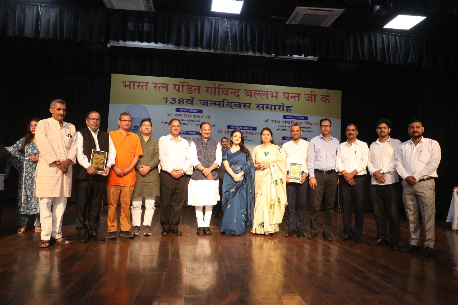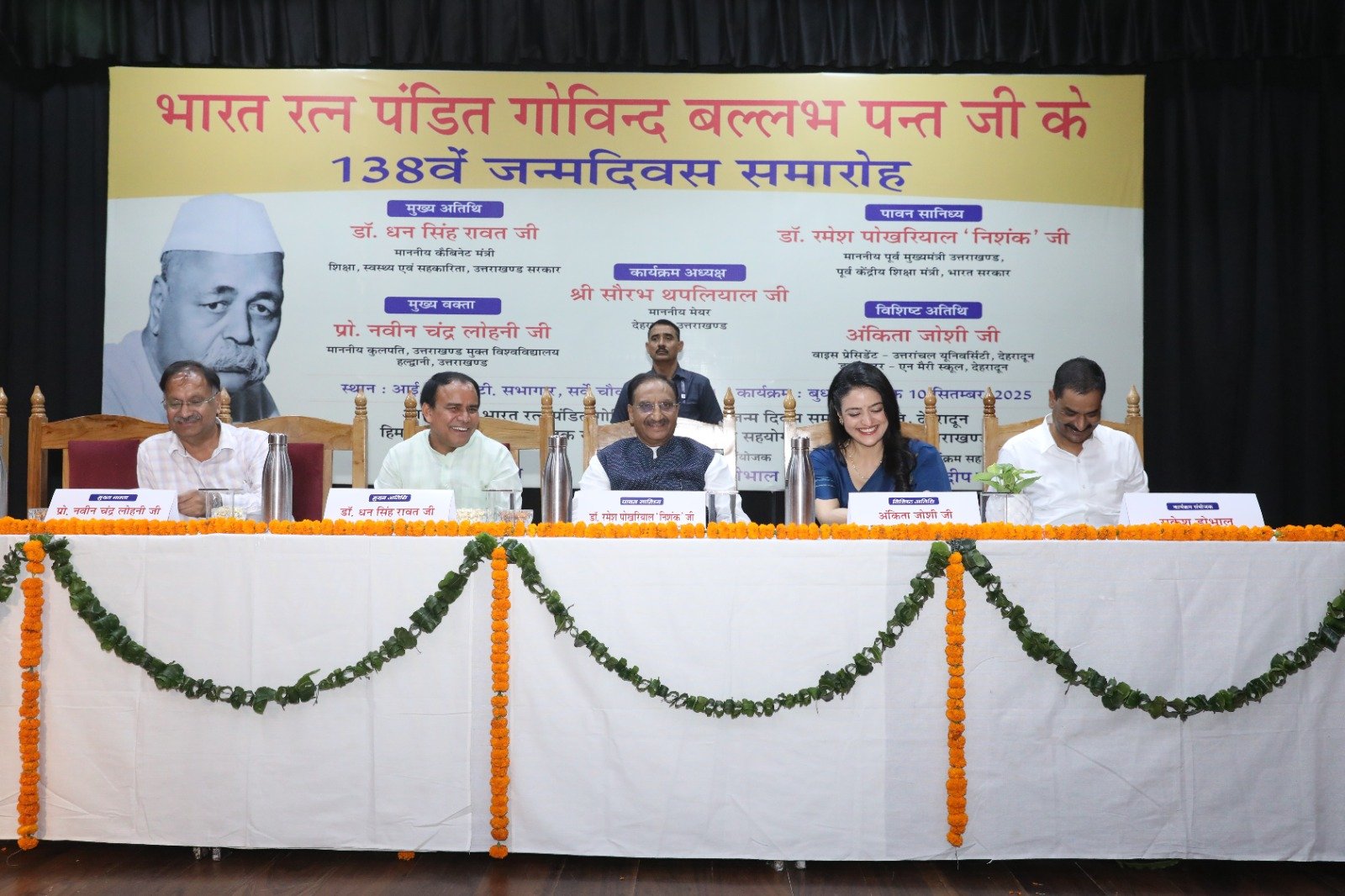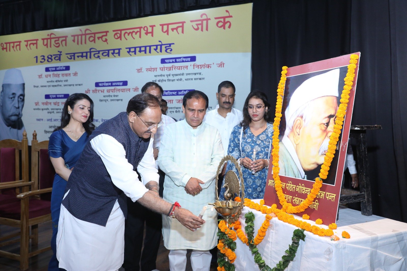 देहरादून : भारत रत्न पंडित गोविंद बल्लभ पंत जी का 138वां जन्मदिवस देहरादून के आई.आर.डी.टी. सभागार में आयोजित किया गया। इस अवसर पर शिक्षा मंत्री डॉ धन सिंह रावत, पूर्व मुख्यमंत्री डॉ रमेश पोखरियाल निशंक, कुलपति मुक्त विश्वविद्यालय प्रो नवीन चन्द्र लोहनी, उपाध्यक्ष उत्तरांचल विश्वविद्यालय अंकिता जोशी एवं कार्यक्रम संयोजक राकेश डोभाल ने संयुक्त रूप से पं. गोविन्द बल्लभ पन्त जी के चित्र के सम्मुख दीप प्रज्वलन व पुष्पांजली कर कार्यक्रम का शुभारंभ किया।