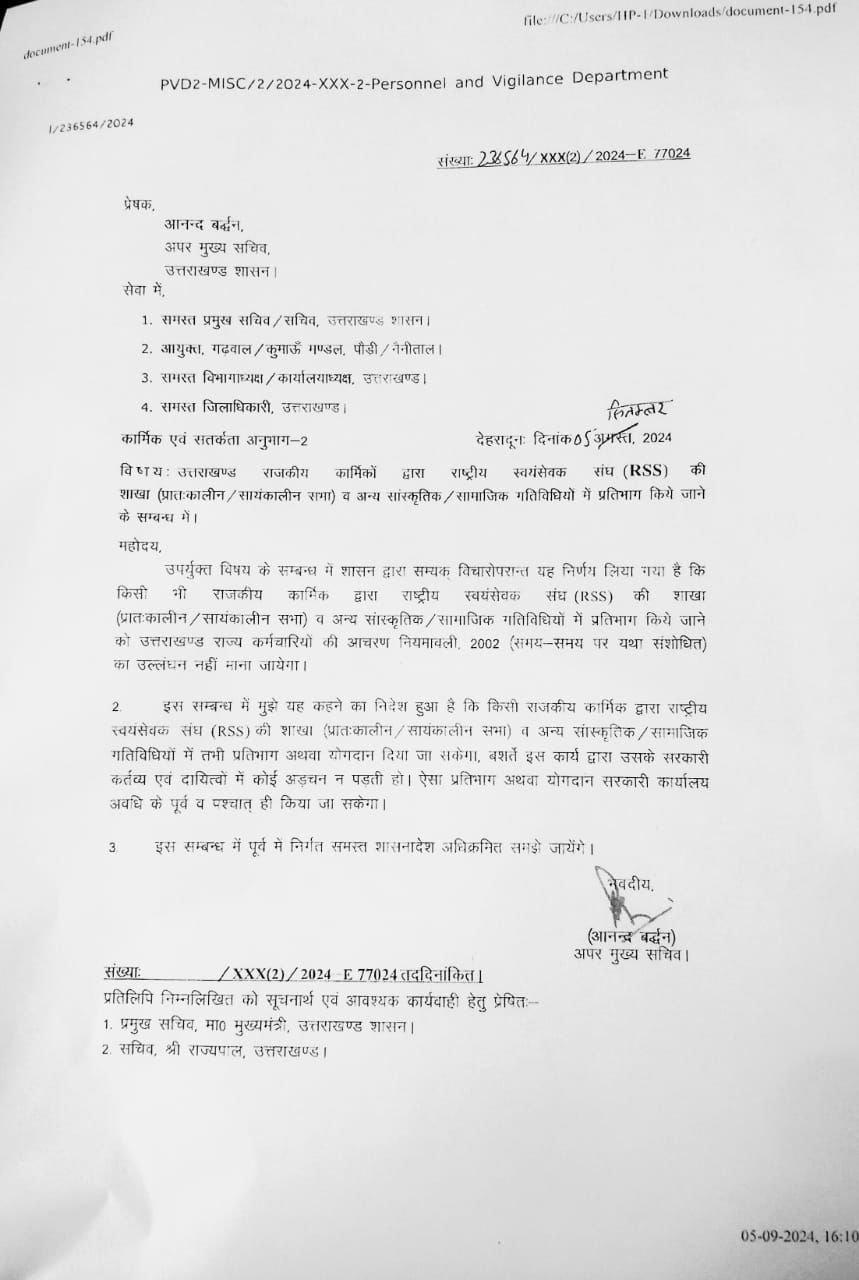 देहरादून : उत्तराखंड सरकार ने राज्य सरकारी कर्मचारियों को राष्ट्रीय स्वयंसेवक संघ (आरएसएस) की शाखा या अन्य किसी कार्यक्रम में शामिल होने की अनुमति दे दी. गुरुवार को उत्तराखंड सरकार धामी सरकार की ओर से कहा गया है कि आरएसएस की शाखाओं या किसी अन्य सांस्कृतिक कार्यक्रम में राज्य सरकार के कर्मचारियों की भागीदारी को उत्तराखंड राज्य कर्मचारी आचरण नियमावली-2002 का उल्लंघन नहीं माना जाएगा.