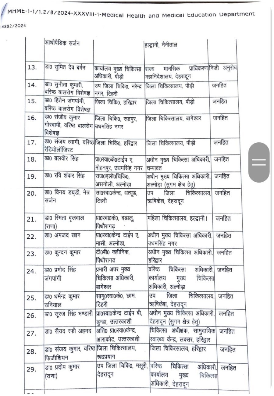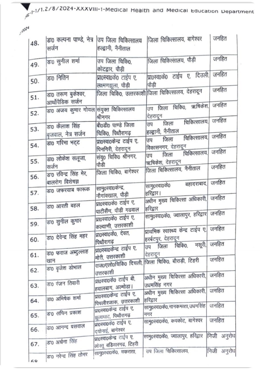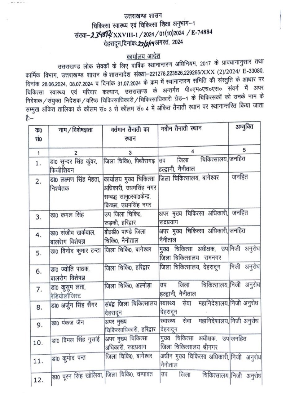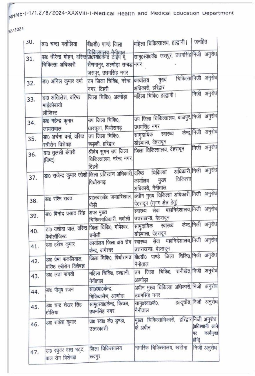उत्तराखंड : स्वास्थ्य विभाग में बम्पर तबादले, सचिव स्वास्थ्य डॉ. आर राजेश कुमार ने किये आदेश जारी, देखें सूचि