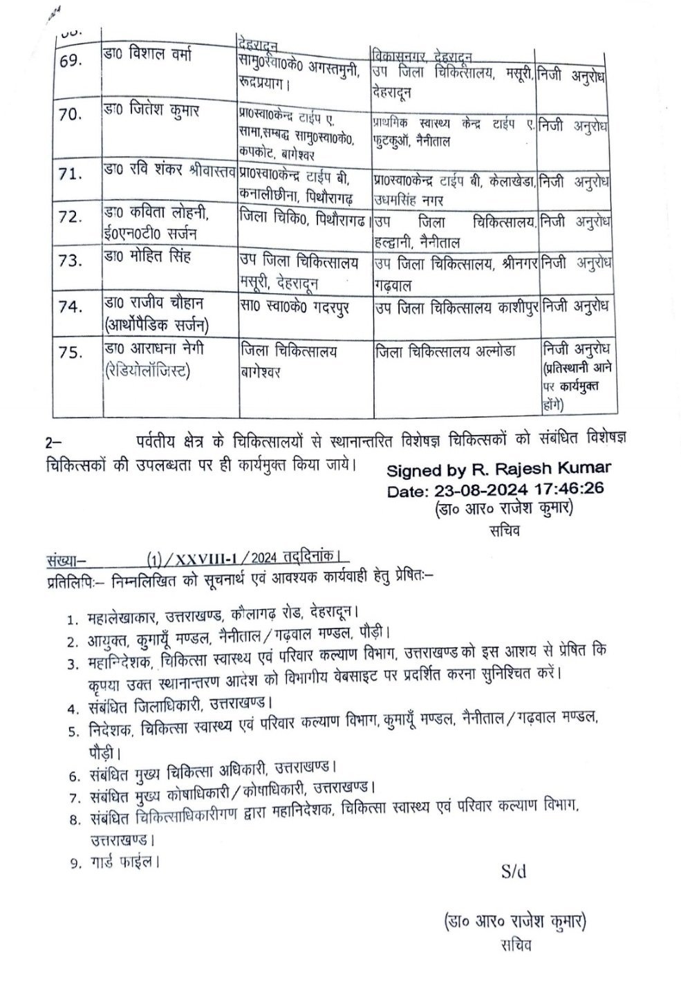 Home » Blog » उत्तराखंड : स्वास्थ्य विभाग में बम्पर तबादले, सचिव स्वास्थ्य डॉ. आर राजेश कुमार ने किये आदेश जारी, देखें सूचि
