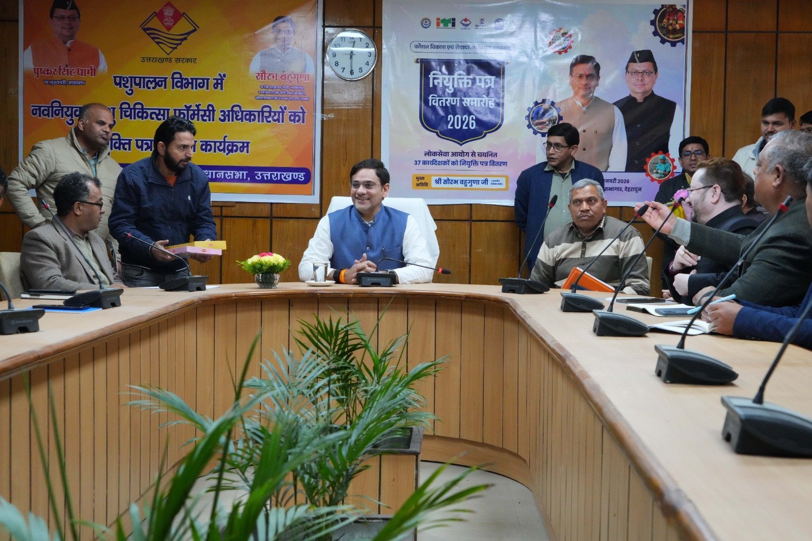 पशुपालन मंत्री सौरभ बहुगुणा ने पशुपालन विभाग के 16 फार्मासिस्ट तथा सेवायोजन विभाग के 37 फोरमैन अनुदेशकों को नियुक्ति पत्र वितरित किये। उन्होंने कहा कि उत्तराखण्ड राज्य स्थापना के बाद पहली बार सेवायोजन विभाग द्वारा कार्मिकों की भर्ती की गई है। उन्होंने कहा कि हमारी सरकार की सोच हर व्यक्ति को रोजगार से जोड़ने की है इस दिशा में आज यह एक महत्वपूर्ण कदम है। बैठक में अपर सचिव पशुपालन संतोष बडोनी, निदेशक प्रशिक्षण संजय खेतवाल तथा विभागीय अधिकारीगण उपस्थित रहे।