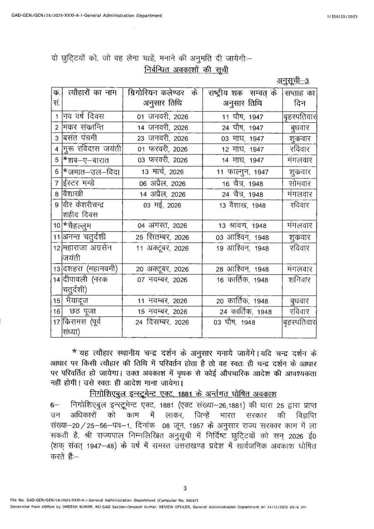देहरादून: उत्तराखंड में आगामी वर्ष 2026 के लिए शासन ने सार्वजनिक अवकाश का कैलेंडर जारी कर दिया है।