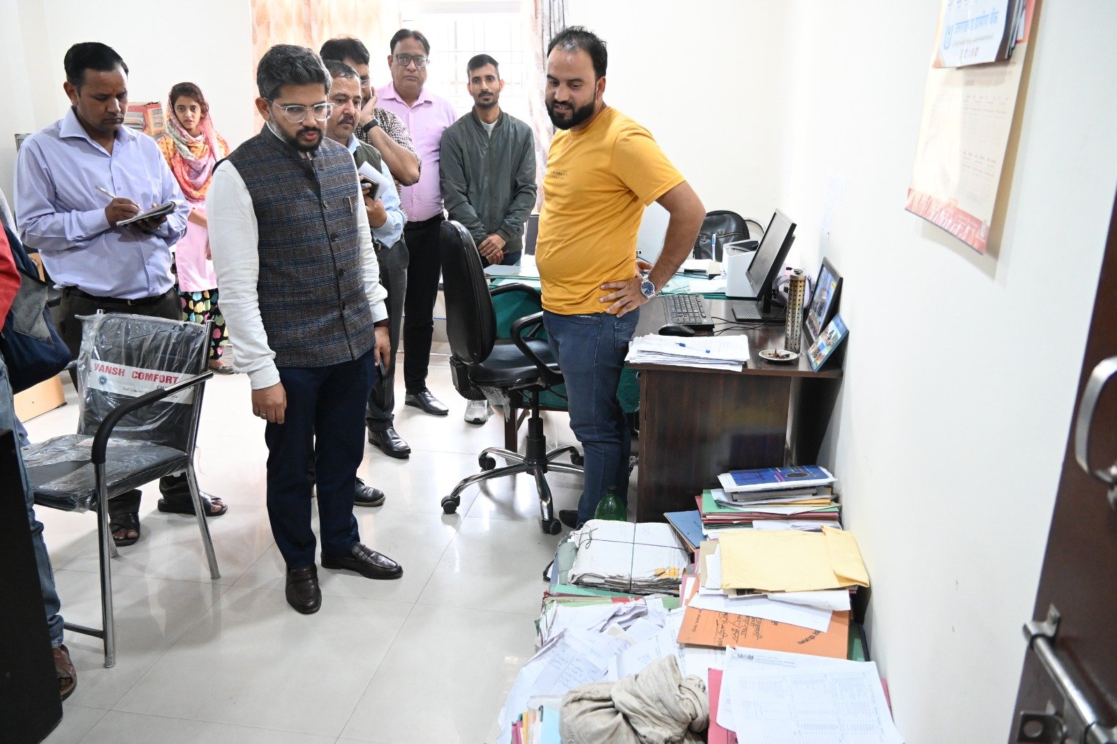 वहीं सहकारिता कक्ष में कनिष्ठ सहायक उपस्थित न रहने पर स्पष्टीकरण तलब किया तथा संतोषजनक उत्तर न दिये जाने पर कार्यवाही के निर्देश दिए।जबकि कनिष्ठ सहायक एवं ब्लॉक कार्डिनेटर के अनुपस्थिति पर स्पष्टीकरण तलब करते हुए वेतन रोकने के निर्देश बीडीओं को दिए। इस दौरान मुख्य विकास अधिकारी ने विकासखण्ड परिसर में अवस्थित इन्दिरा अम्मा भोजनालय का निरीक्षण किया। पंचायती राज विभाग के कार्यालय में सामग्री एवं पत्रावली व्यवस्थित न रखने पर नाराजगी जाहिर करते हुए नोटिस जारी किया तथा सामग्री रखने हेेतु आलमारी क्रय करने के निर्देश दिए। निरीक्षण के दौरान मुख्य चिकित्साधिकारी डॉ संजय जैन, जिला विकास अधिकारी सुनील कुमार सहित सम्बन्धित अधिकारी उपस्थित रहे।