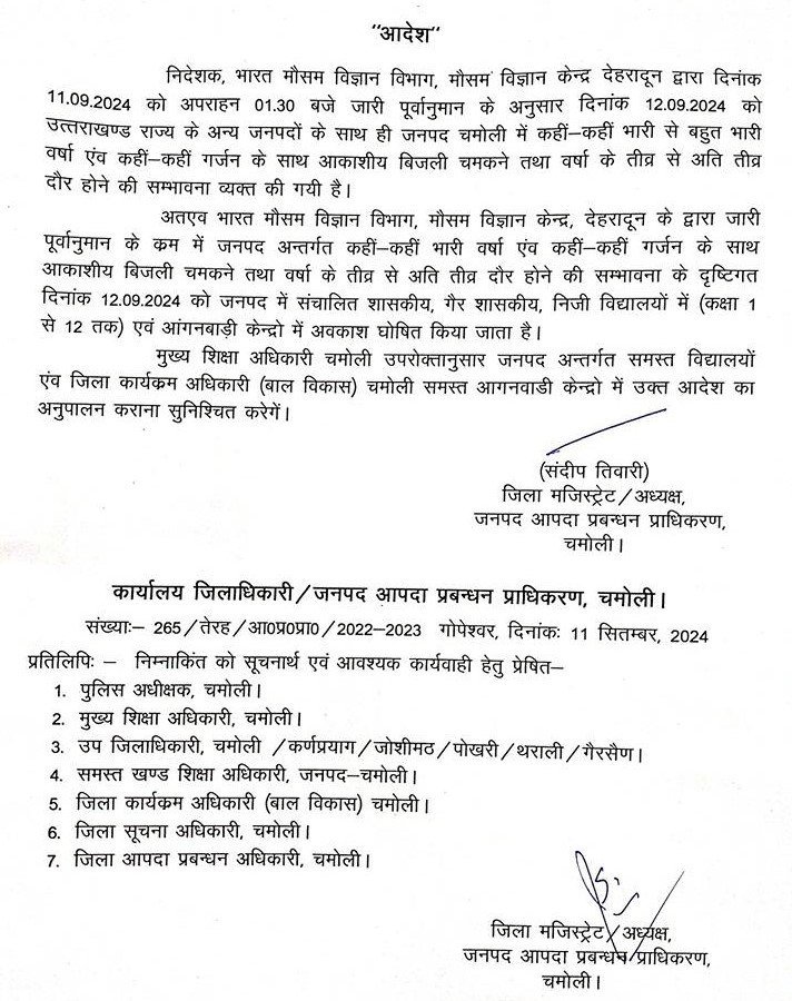 गोपेश्वर (चमोली)। मौसम विभाग की ओर से जारी पूर्वानुमान के तहत चमोली जिले में कहीं-कहीं भारी वर्षा और गर्जना के साथ आकाशीय बिजली चमकने तथा तीव्र तथा अति तीव्र वर्षा की संभावना को देखते हुए जिलाधिकारी ने गुरूवार 12 सितम्बर को जिले के कक्षा एक से 12 तक के सभी शासकीय और गैर शासकीय तथा निजी विद्यालयों के साथ ही आंगनवाडी केंद्रों में अवकाश की घोषणा की है। साथ ही मुख्य शिक्षा अधिकारी चमोली को शिक्षण संस्थाओं में तथा जिला कार्यक्रम अधिकारी को आदेश का अनुपालन करने के निर्देश दिए है।