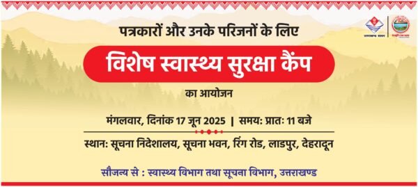 देहरादून। उत्तराखण्ड में पत्रकारों और उनके परिजनों के स्वास्थ्य की चिंता को लेकर राज्य सरकार बेहद गम्भीर है। मुख्यमंत्री पुष्कर सिंह धामी के निर्देश पर, मंगलवार 17 जून को सूचना निदेशालय, रिंग रोड, देहरादून में एक विशेष नि:शुल्क स्वास्थ्य सुरक्षा कैम्प का आयोजन किया जा रहा है।यह कैम्प स्वास्थ्य विभाग व सूचना विभाग के संयुक्त प्रयास से प्रातः 11 बजे से शुरू होगा।