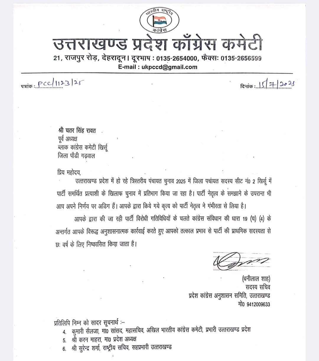 देहरादून : उत्तराखंड कांग्रेस कमेटी की ओर से लम्बे समय से पार्टी विरोधी गतिविधियों में संलिप्त तीन पार्टी नेताओं को तत्काल प्रभाव से कांग्रेस पार्टी की प्राथमिक सदस्यता से 6 साल के लिए निष्कासित किया गया है। पोखडा ब्लाक कांग्रेस कमेटी के अध्यक्ष कीरत सिंह रावत की ओर से पार्टी समर्थित उम्मीदवार होने के बावजूद विपक्षी उम्मीदवार के के समर्थन में अपना नामांकन वापस लेकर न केवल कांग्रेस पार्टी बल्कि स्थानीय जनता और कांग्रेसजनों की भावनाओं के साथ भी खिलवाड कर धोखा दिया गया है। इसी प्रकार पूर्व ब्लाक अध्यक्ष खिर्सू चतर सिंह रावत की ओर से पार्टी के समर्थित उम्मीदवार के खिलाफ चुनाव में प्रतिभाग किया जा रहा है। जिसे कांग्रेस नेतृत्व ने गम्भीरता से लिया है।
