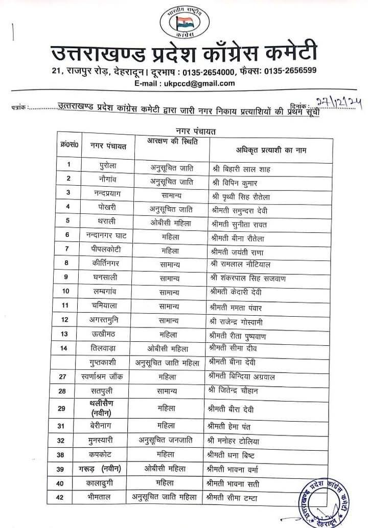 नगर निगम श्रीनगर से मीना रावत, नगर निगम काशीपुर से संदीप सहगल, हल्द्वानी से ललित जोशी को प्रत्याशी बनाया गया है। नगर पालिका बागेश्वर में कवि जोशी, खटीमा उमेश राठौर, बाजपुर गुरजीत सिंह गित्ते, सितारंगंज राजेश कुमार, बागेश्वर कवित जोशी, दुगडडा पूजा देवी, टिहरी कुल्दीप पंवार, कीर्तिनगर रामलाल नौटियाल, ढालवाला उर्मिला राणा, दुगड्डा धना बिष्ट, जोशीमठ देवेश्वरी शाह, गोपेश्वर प्रमोद बिष्ट, कर्णप्रयाग रामदयाल, गोचर संदीप नेगी, थराली सुनीता रावत, उत्तरकाशी दिनेश गौड़, चिन्यालीसौड दर्शन लाल, बड़कोट विजयपाल रावत, नैनीलताल सरस्वती खेतवाल, भवाली पंकज कुमार आर्य, रूद्रप्रयाग दीपक भंडारी, नगर पंचायत नानकमत्ता मनोज कुमार, शक्ति फार्म राखी विश्वास, गुलर भेाज किशोर सामंत, सुल्तानपुर पट्टी मोहम्मद रफी, बेरीनाग हेमा पंत, मुनस्यारी मनोहर टोलिया, स्वागस्श्रम जोंक बिन्दिया अग्रवाल, गरूड भावना वर्मा, कपकोट धना बिष्ट, सतपुली जितेन्द्र चोहान, थलीसैण वीरा देवी, घनसाली शंकरपाल सिंह सजवाण, चमियाला ममता पंवार, पीपलकोटी जयंती राणा, पोखरी समुन्दरा देवी, घाट मीना रौतेला, नन्द प्रयाग पृथ्वी सिंह रौतेला, पुरेाला बिहारी लाल शाह, नौगाव विपिन कुमार, भीमताल सीमा टम्टा, कालाढूंगी भावना सती, तिलवाडा सीमा देवी, गुप्तकाशी बीना देवी, अगस्त्यमनि राजेन्द्र गोस्वामी, उखीमठ रीता पुष्पवाण को पार्टी का अधिकृत प्रत्याशी बनाया गया है।