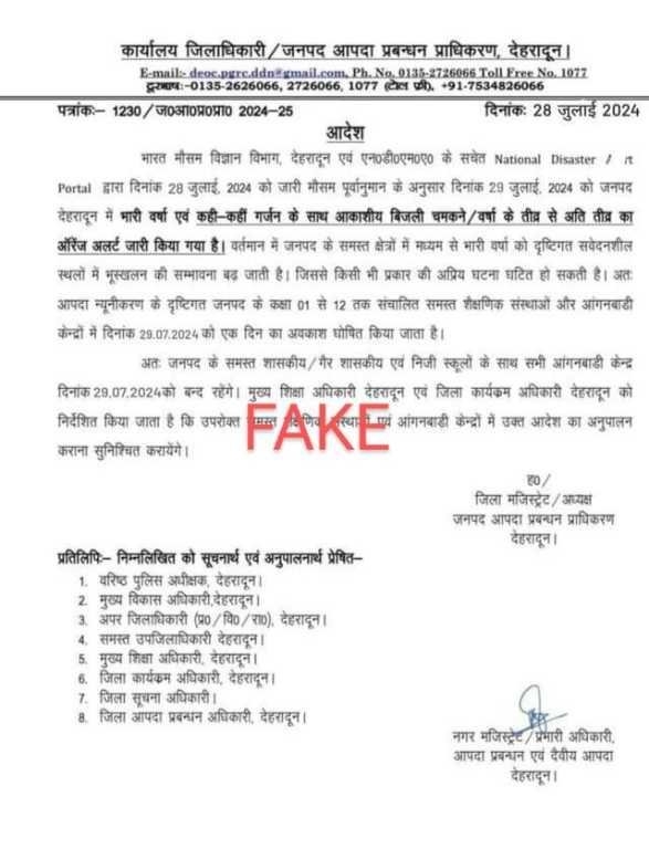 देहरादून : भारी बारिश का अलर्ट, स्कूलों में छुट्टी का फर्जी आदेश सोशल मीडिया वायरल