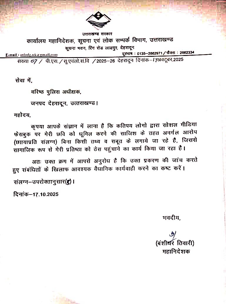 देहरादून । राज्य के महानिदेशक सूचना बंशीधर तिवारी ने सोशल मीडिया पर उनके खिलाफ चल रहे दुष्प्रचार और फेक पोस्ट्स के मामले में वरिष्ठ पुलिस अधीक्षक देहरादून अजय सिंह को पत्र लिखा है। उन्होंने अपनी छवि धूमिल करने की साजिश में शामिल व्यक्तियों के खिलाफ वैधानिक कार्रवाई की मांग की है।