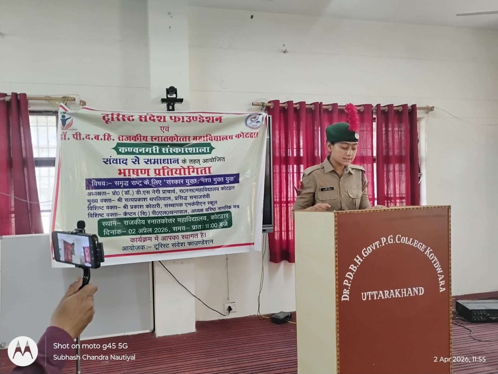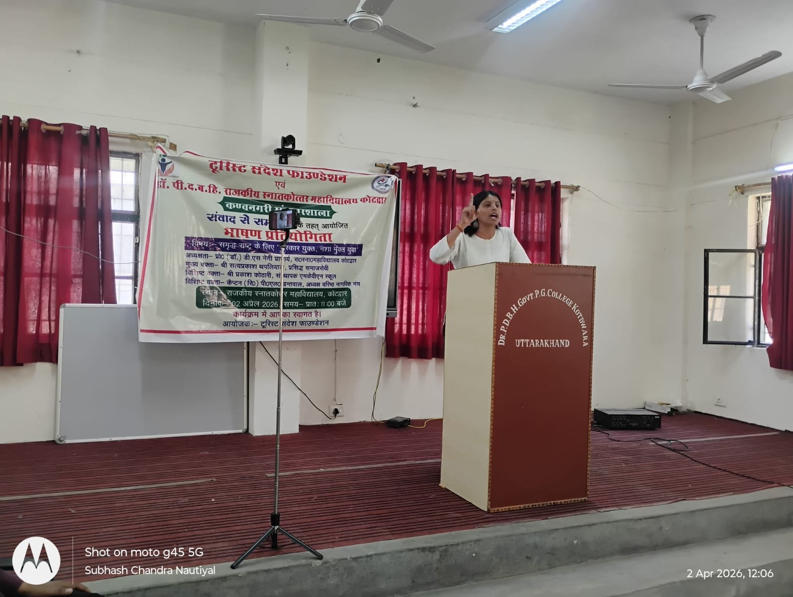 कोटद्वार : टूरिस्ट संदेश फाॅउण्डेशन तथा डॉ. पी.द.ब.हि.रा.स्ना.महावि. कोटद्वार के संयुक्त तत्वावधान में काॅलेज के प्राचार्य प्रोफेसर (डॉ.) डी.एस.नेगी की अध्यक्षता में समृद्ध राष्ट्र के लिए ‘संस्कार युक्त, नशामुक्त युवा’ विषय पर एक भाषण प्रतियोगिता का आयोजन किया गया। कार्यक्रम के संयोजक सुभाष चन्द्र नौटियाल तथा काॅलेज में एंटी ड्रग क्लब के नोडल अधिकारी जुनिस कुमार के संयोजन में आयोजित इस भाषण प्रतियोगिता के मुख्य वक्ता प्रसिद्ध समाजसेवी सत्य प्रकाश थपलियाल तथा विशिष्ट वक्ता प्रकाश कोठारी एवं कै. पी.एल.खन्तवाल थे। भाषण प्रतियोगिता में काॅलेज के छात्र-छात्राओं ने बढ़-चढ़कर हिस्सा लिया। भाषण प्रतियोगिता में प्रथम स्थान एमकाॅम द्वितीय सेमेस्टर की छात्रा धरा रावत, द्वितीय स्थान एम. ए. चतुर्थ सेमेस्टर की छात्रा श्वेता बेंजवाल तथा तृतीय स्थान आशीष काला बीए द्वितीय सेमेस्टर ने हासिल किया।