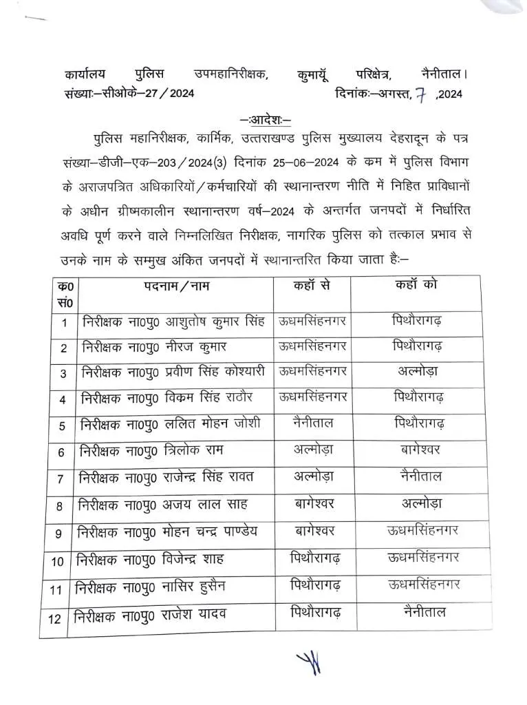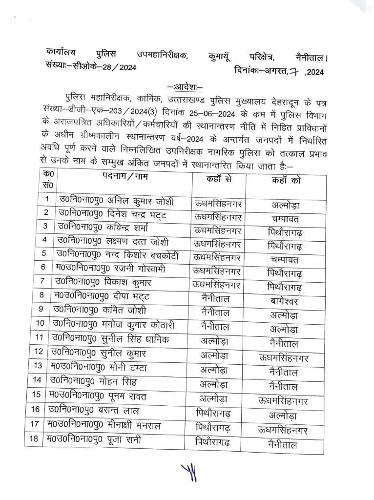 नैनीताल : DIG ने कुमाऊं में बड़ी संख्या में इंस्पेक्टर और दरोगाओं के ट्रांसफर किए हैं। मैदानी जिलों जमे में इंस्पेक्टर और दरोगाओं को जहां पहाड़ चढ़या गया। वहीं, सालों से पहाड़ों पर नौकरी कर रहे इंस्पेक्टर व दरोगाओं को मैदानी जिलों में तैनाती दी गई है।