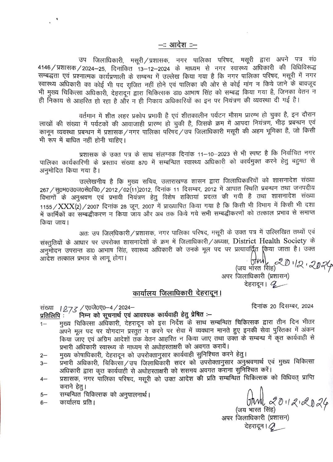 मसूरी में तैनात नगर स्वास्थ्य अधिकारी की लम्बे समय से मिल रही थी प्रश्नात्मक कार्यप्रणाली की शिकायतें। निकाय चुनाव में अधिकारियों के मध्य कार्य विभाजन में व्यवधान उत्पन्न करने की भी शिकायत हो रही थी प्राप्त। साथ ही लोगों को परेशान करने की भी मिल रही थी शिकायत, वर्ष 2021 से मसूरी नगर पालिका परिषद मसूरी में अनाधिकृत रूप से कार्यरत थे, नगर स्वास्थ्य अधिकारी। उप जिलाधिकारी/प्रशासक नगर पालिका परिषद मसूरी भी स्वास्थ्य अधिकारी की कार्यप्रणाली पर उठा चुके हैं सवाल। प्रशासकों के निकाय चुनाव के दृष्टिगत कार्य विभाजन कार्यों में आपत्ति उठाने सम्बन्धी शिकायत भी मिल रही थी।