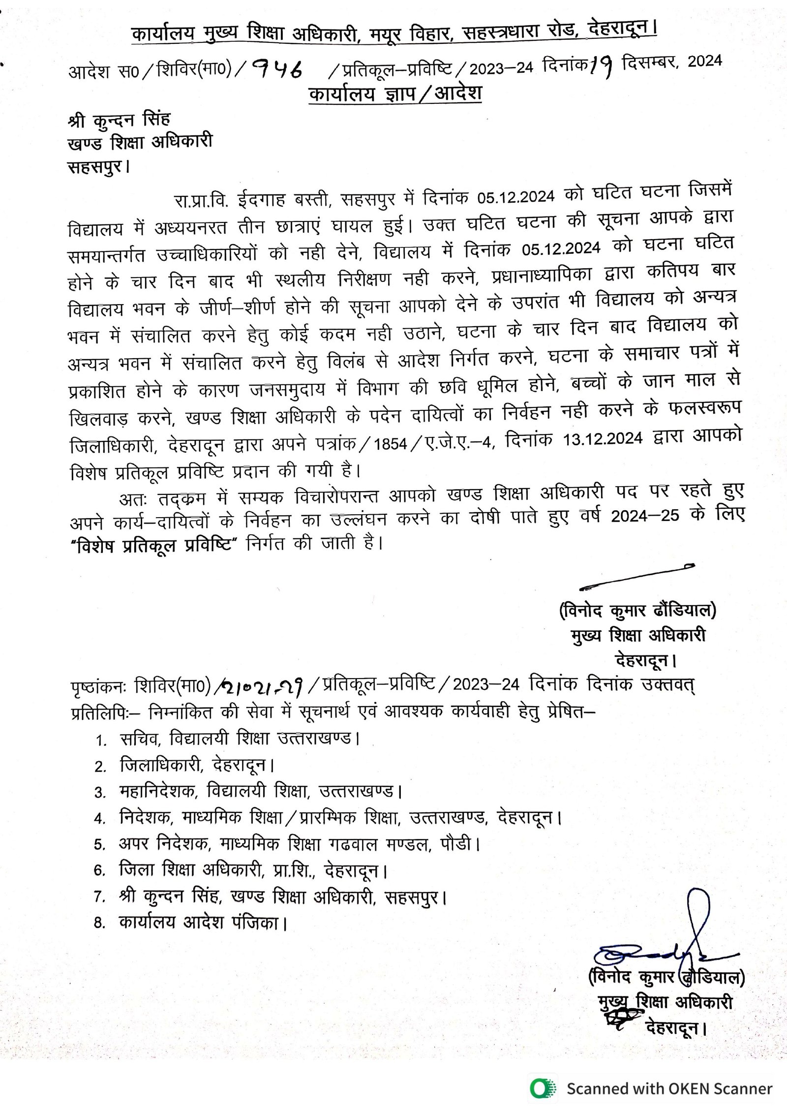 देहरादून : रा.प्रा.वि. ईदगाह बस्ती, सहसपुर में 05 दिसम्बर 2024 को घटित घटना जिसमें विद्यालय में अध्ययनरत तीन छात्राएं घायल हुई। उक्त घटित घटना की सूचना बीईओ द्वारा समयान्तर्गत उच्चाधिकारियों को नही देने, विद्यालय में घटना घटित होने के चार दिन बाद भी स्थलीय निरीक्षण नही करने, प्रधानाध्यापिका द्वारा कतिपय बार विद्यालय भवन के जीर्ण-शीर्ण होने की सूचना के उपरांत भी विद्यालय को अन्यत्र भवन में संचालित करने हेतु कोई कदम नही उठाने, घटना के चार दिन बाद विद्यालय को अन्यत्र भवन में संचालित करने हेतु विलंब से आदेश निर्गत करने पर हुई कार्यवाही । घटना के कारण जनसमुदाय में विभाग प्रशासन की छवि धूमिल होने, बच्चों के जानमाल से खिलवाड़ करने, खण्ड शिक्षा अधिकारी के पदेन दायित्वों का निर्वहन नही करने के फलस्वरूप जिलाधिकारी, देहरादून द्वारा दी गई थी विशेष प्रतिकूल प्रविष्टि। खण्ड शिक्षा अधिकारी पद पर रहते हुए अपने कार्य-दायित्वों के निर्वहन का उल्लंघन करने का दोषी पाते हुए वर्ष 2024-25 के लिए विशेष प्रतिकूल प्रविष्टिनिर्गत की गयी।