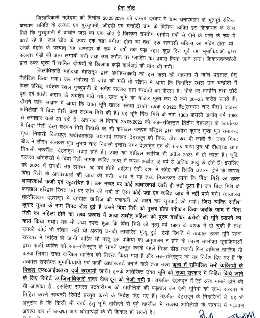 जिलाधिकारी द्वारा तहसीलदार सदर मोहम्मद शादाब को इस कृत्य की गहनता से जांच-पड़ताल हेतु निर्देशित किया गया। तहसीलदार सदर द्वारा इस प्रकरण की गंभीरता से जांच की गयी तो संज्ञान में आया कि विवादित स्थल ग्राम चन्द्रोटी में विश्व प्रसिद्ध पर्यटक स्थल गुच्चुपानी के समीप राजस्व ग्राम चन्द्रोटी का हिस्सा है। मौके पर वनाग्नि तथा छोटे वृक्ष एवं झाड़ी कटान के अवशेष पाये गये। उक्त भूमि का बाजार मूल्य कम से कम 20-25 करोड़ रूपये हैं। दौराने जांच संज्ञान में आया कि उक्त भूमि खसरा संख्या 374ग रकबा 0.3120 है0 (लगभग चार बीघा) राजस्व अभिलेखों में बिंदा गिरी चेला लक्ष्मण गिरी की है। यह भूमि बिंदा गिरी के नाम 1360 फसली अर्थात् वर्ष 1953 से लगातार चली आ रही है। अचानक से 25 मई 2022 को सब-रजिस्ट्रार द्वितीय देहरादून के कार्यालय में बिंदा गिरी चेला लक्ष्मण गिरी निवासी 65 सी कनखल जनपद हरिद्वार द्वारा सतीश कुमार गुप्ता पुत्र रामानन्द गुप्ता निवासी विजयपुर हाथीबड़कला नयागावं जनपद देहरादून को गिफ्ट डीड कर दी जाती है। उक्त गिफ्ट डीड में सौरभ सोनकर पुत्र सुभाष चन्द्र निवासी इन्द्रेश नगर देहरादून एवं संजय थापा पुत्र टीएस थापा निवासी नकरौंदा, देहरादून गवाह होते हैं। उक्त का दाखिल खारिज भी अप्रैल 2023 में हो जाता है।