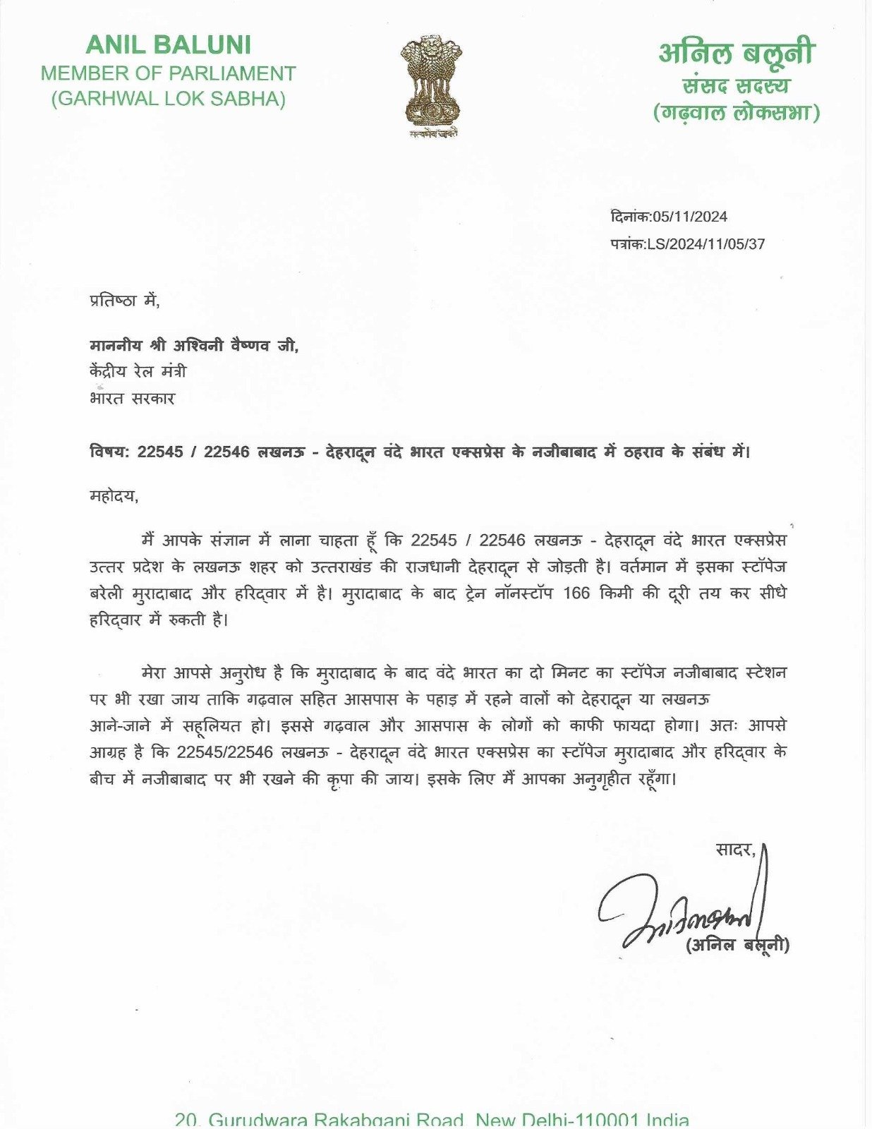 गढ़वाल सांसद अनिल बलूनी ने केंद्रीय रेल मंत्री अश्विनी वैष्णव से किया अनुरोध, लखनऊ-देहरादून वंदे भारत एक्सप्रेस का नजीबाबाद में की स्टॉपेज निर्धारित करने की मांग