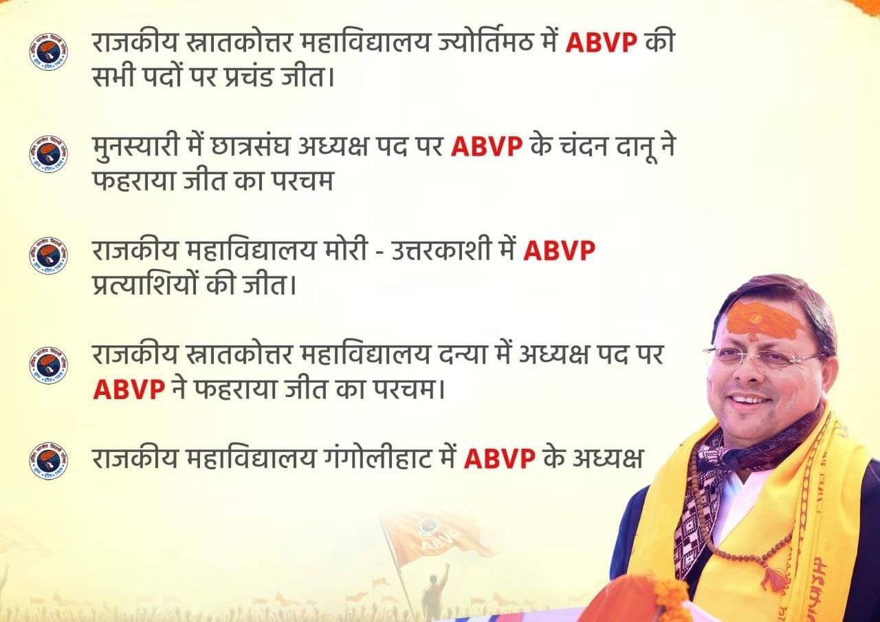 छात्रसंघ चुनावों में अखिल भारतीय विद्यार्थी परिषद (ABVP) को मिली बड़ी और ऐतिहासिक जीत ने साबित कर दिया कि युवाओं का झुकाव भाजपा और उसकी नीतियों के पक्ष में है। खासतौर पर Gen-Z ने अपने वोट से यह संदेश दिया है कि वह मुख्यमंत्री पुष्कर सिंह धामी के नेतृत्व पर भरोसा रखते हैं और सरकार के कामकाज को समर्थन देते हैं।
