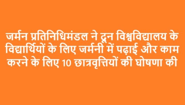 देहरादून : देहरादून के तीन दिवसीय दौरे पर आए एक उच्च स्तरीय जर्मन प्रतिनिधिमंडल ने दून विश्वविद्यालय के विद्यार्थियों के लिए 10 छात्रवृत्तियों की घोषणा की है। जर्मनी के फ्रैंकफर्ट शहर द्वारा दी जाने वाली इन छात्रवृत्तियों के अंतर्गत दून विश्वविद्यालय के छात्र उच्च शिक्षा, कौशल प्रशिक्षण तथा रोजगार के अवसर जर्मनी में तलाशने के लिए प्राप्त कर सकेंगे। यह घोषणा दून विश्वविद्यालय में आयोजित “गेटवे टू जर्मनी – ब्रिजिंग स्किल गैप्स, बिल्डिंग फ्यूचर्स” नामक संवादात्मक सत्र के दौरान की गई, जिसमें 500 से अधिक विद्यार्थी शामिल हुए। छात्रवृत्ति के अंतर्गत चुने गए विद्यार्थियों का शिक्षा शुल्क, वीज़ा शुल्क, यात्रा, आवास और अन्य सभी खर्चों का वहन किया जाएगा।