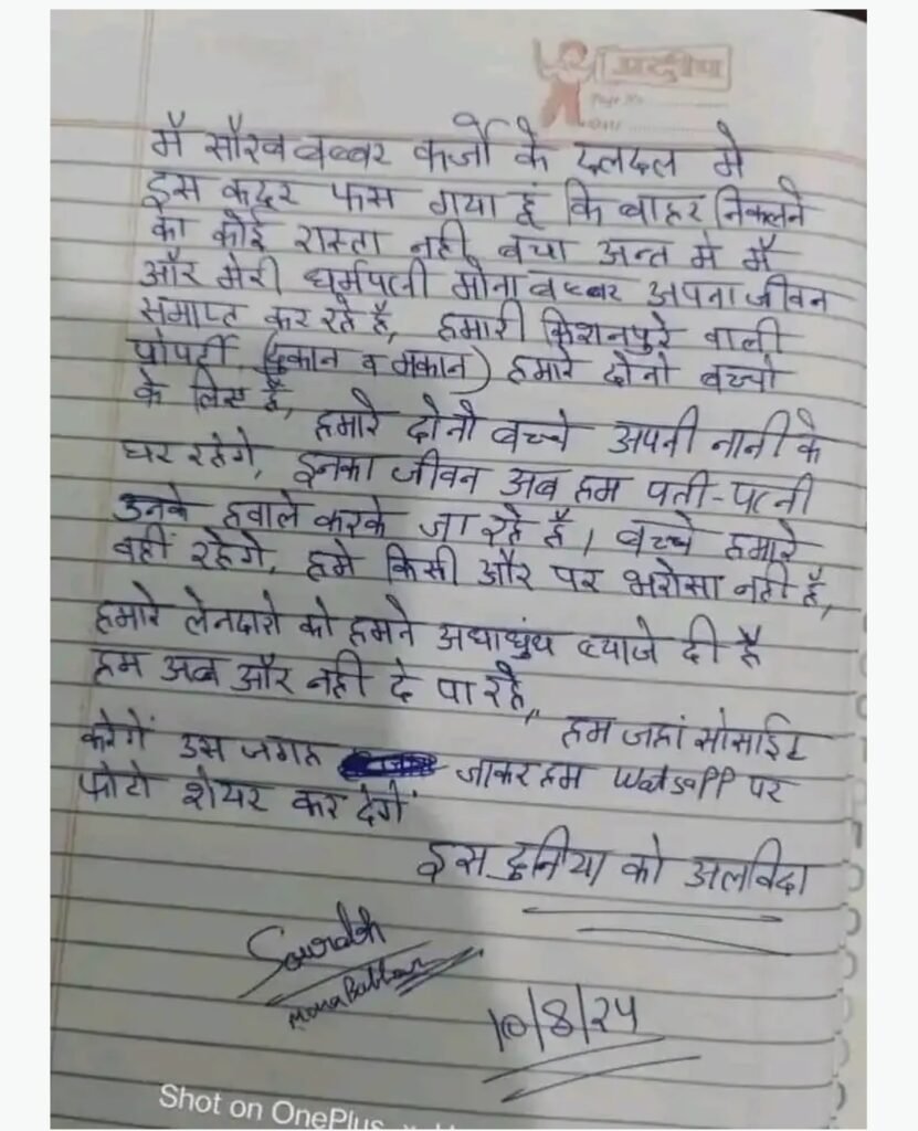 दोनों सुसाइड करने के लिए नई बाइक से हरिद्वार पहुंचे और एक-दूसरे का हाथ पकड़कर छलांग लगा दी। कारोबारी का शव गंगा में तैरता मिला, जबकि पत्नी अभी भी लापता है। मरने से पहले कारोबारी ने वॉट्सएप पर सुसाइड नोट अपने रिश्तेदारों को भेजा था, जिसमें उसने कर्ज का जिक्र किया है। उसमें ब्याज का पैसा देते-देते थक जाने की बात कही गई है। साथ ही सुसाइड करने से पहले की फोटो भी शेयर की है, जिसमें वह गंगा नदी के किनारे खड़े हैं।