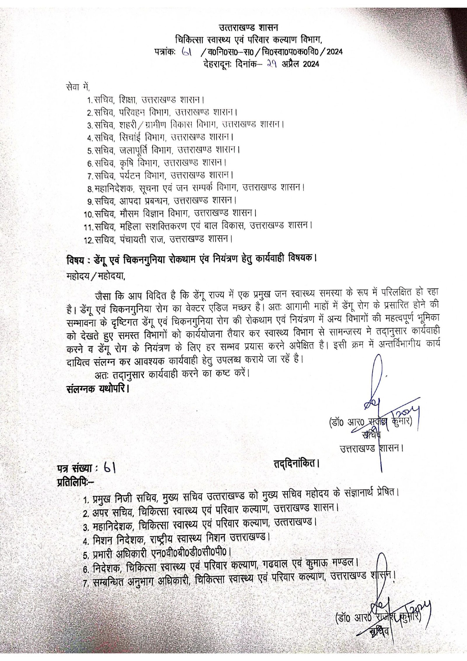 - डेंगू और चिकनगुनिया को लेकर स्वास्थ्य विभाग का अर्लट, स्वास्थ्य सचिव डॉ आर राजेश कुमार ने जारी की 20 बिन्दुओं की गाइडलाइंस