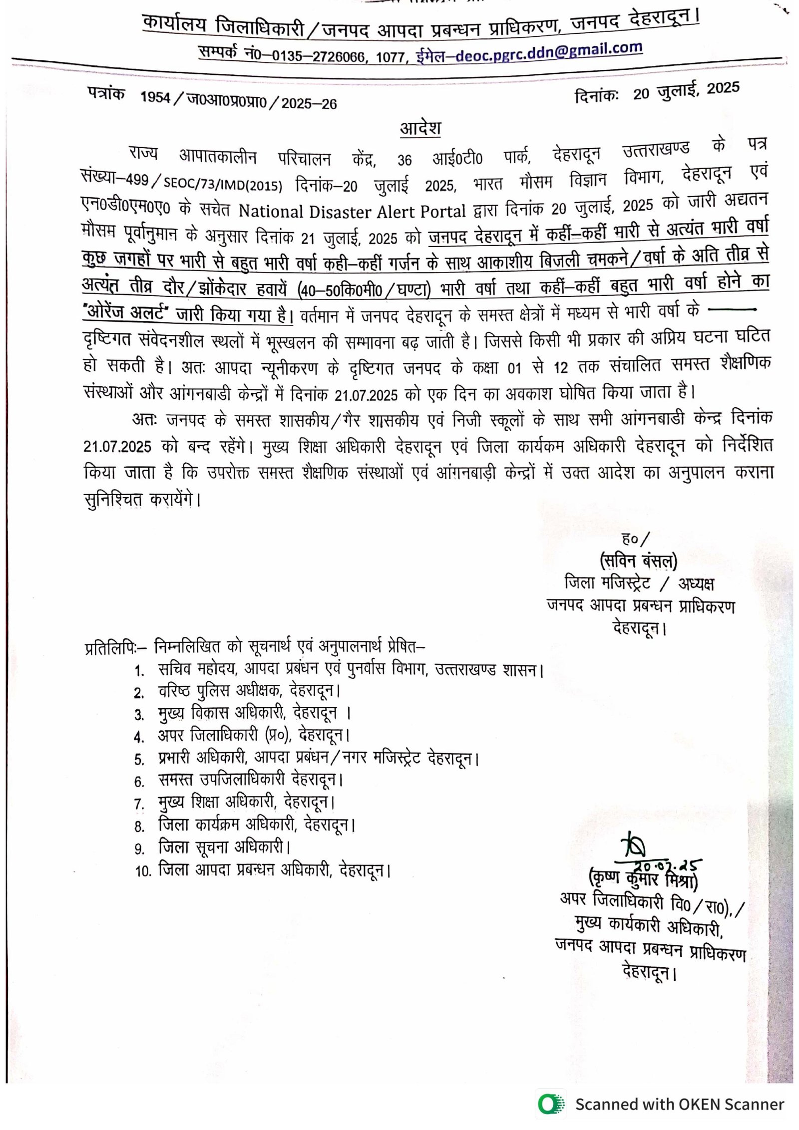 देहरादून : राजधानी देहरादून समेत राज्य के कई जिलों में भारी बारिश की संभावना को देखते हुए ऑरेंज अलर्ट जारी किया गया है। भारी बारिश को देखते हुए राजधानी देहरादून के सभी स्कूलों में छुट्टी दे दी गई है। अपर जिलाधिकारी के द्वारा जारी पत्र में कक्षा 1 से 12 वीं तक के सभी स्कूलों में कल छुट्टी रहेगी।