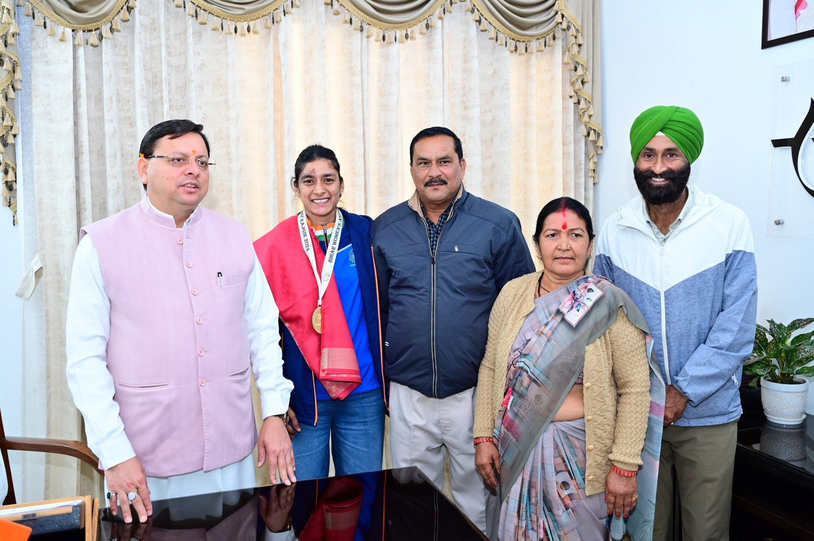 मुख्यमंत्री पुष्कर सिंह धामी से एशियाई चैंपियंस ट्रॉफी विजेता महिला हॉकी टीम की सदस्य मनीषा चौहान ने की शिष्टाचार भेंट