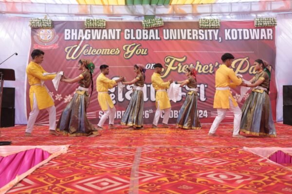 कोटद्वार : भाबर स्थित भगवंत ग्लोबल विश्वविद्यालय में नवागंतुक विद्यार्थी समारोह का आयोजन किया गया, जिसमें आकर्षक प्रस्तुतियां दी गई। कार्यक्रम का शुभारंभ मुख्य अतिथि डॉ. प्रवीण कुमार मुख्य चिकित्साधिकारी पौड़ी, भगवंत ग्रुप के सदस्य डॉ. विभांशु विक्रम सिंह प्रबन्ध निदेशक बैक्सिल फार्मा, विश्वविद्यालय के प्रति -कुलपति प्रो. पी.एस. राणा व ए.एस. कैंतुरा द्वारा दीप प्रज्वलित कर किया गया। विश्वविद्यालय के प्रति कुलपति,डीन व सहा. कुलसचिव द्वारा अतिथियों का पुष्प गुच्छ व स्मृति चिन्ह भेंट कर स्वागत किया गया।