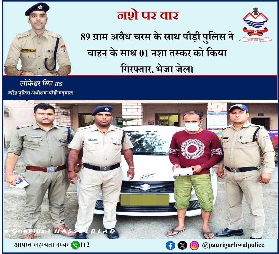 कोटद्वार । मुख्यमंत्री उत्तराखंड ने वर्ष-2025 तक उत्तराखण्ड को नशामुक्त बनाए जाने हेतु चलाये जा रहे अभियान के क्रम में वरिष्ठ पुलिस अधीक्षक पौड़ी लोकेश्वर सिंह के निर्देशन में बढते नशे की प्रवृत्ति पर अंकुश लगाने तथा आगामी लोकसभा चुनाव में नशा तस्करी की रोकथाम के लिए पौड़ी पुलिस द्वारा नशा तस्करों पर लगातार शिकंजा कसा जा रहा है, नशा तस्करों के विरुद्ध लगातार अभियान चलाकर उनके विरुद्ध कड़ी से कड़ी कार्यवाही की जा रही है, जिसके क्रम में कोतवाली कोटद्वार पुलिस ने चैकिंग के दौरान मनोज सिंह भण्डारी पुत्र प्रकाश सिंह भण्डारी, निवासी ग्राम सुराड़ी, पो0-चैलूसैण, तहसील लैन्सडाउन, जनपद पौड़ी गढ़वाल को पनियाली गेस्ट हाउस कोटद्वार के पास से वाहन संख्या UK 15TA 0689, स्विफ्ट कार में 89 ग्राम अवैध चरस का परिवहन करते हुए गिरफ्तार किया गया। जिस सम्बन्ध में वाहन को सीज करते हुये अभियुक्त के विरूद्ध कोतवाली कोटद्वार में एनडीपीएस के तहत अभियोग पंजीकृत किया गया। अभियुक्त को माननीय न्यायालय के समक्ष पेश कर न्यायिक हिरासत में जेल भेज दिया गया है।