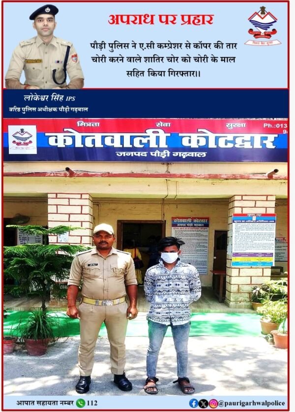 कोटद्वार। एआईए सिक्योरिटी ब्रांच आफिस देवी रोड़ कोटद्वार निवासी पिंटू कुमार ने कोतवाली कोटद्वार में दर्ज कराई गई रिपोर्ट में बताया कि किसी अज्ञात व्यक्ति ने उसके आफिस टाटा एआईए लाइफ इन्शयोरेन्स निकट देववाणी होटल, देवी रोड़ कोटद्वार में लगे एसी कम्प्रेशर के पाइपों से कॉपर की तार चोरी व क्षतिग्रस्त कर दी है। वरिष्ठ पुलिस अधीक्षक लोकेश्वर सिंह ने चोरी की उक्त घटना का शीघ्र खुलासा करने के निर्देश पर कोतवाली प्रभारी निरीक्षक मणिभूषण श्रीवास्तव के नेतृत्व में गठित पुलिस टीम ने सीसीटीवी कैमरों की मदद से अभियोग में संलिप्त झूलापुल स्कूल नम्बर 3, लकड़ी पड़ाव कोटद्वार निवासी 19 वर्षीय फारूख पुत्र स्व0 शरीफ जमील को दिल्ली फार्म रोड़ कोटद्वार के पास से तीन किलो चोरी किए गए तांबे के तार के साथ गिरफ्तार किया गया। पुलिस टीम में वरिष्ठ उपनिरीक्षक जयपाल सिंह चौहान, उपनिरीक्षक मेहराजुद्दीन, मुख्य आरक्षी हेमन्त कुमार, सुनील मलिक व आरक्षी चन्द्रपाल शामिल थे।