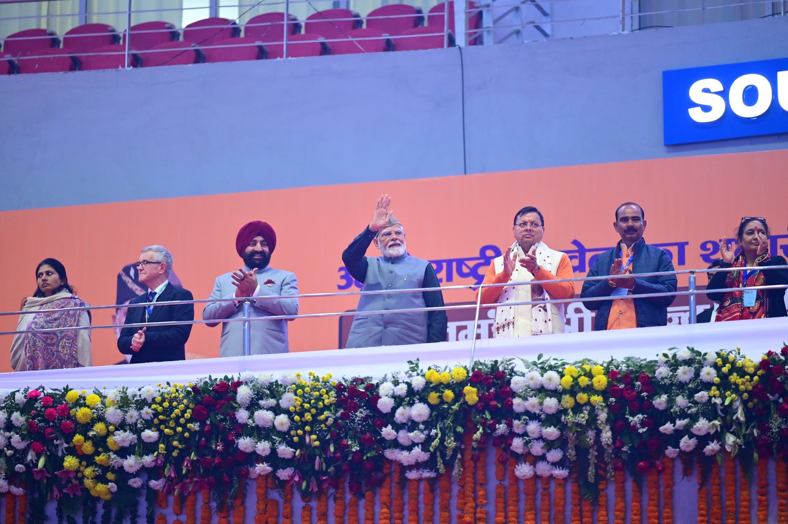प्रधानमंत्री ने मंच पर ही अंतरराष्ट्रीय प्रतियोगिता में भाग लेने वाले उत्तराखंड के कई खिलाड़ियों से मुलाकात की। इसमें जसपाल राणा, मनीष रावत, लक्ष्य सैन, सुरेंद्र कनवासी-, हंसा मनरालशर्मा, नितेंद्र रावत, सुभाष राणा, मनोज सरकार शामिल रहे। इससे पहले मुख्यमंत्री पुष्कर सिंह धामी ने प्रधानमंत्री को उत्तराखंड की प्रचलित टोपी पहनाई। समारोह में विधानसभा अध्यक्ष ऋतु भूषण खंडूड़ी, केंद्रीय युवा एवं खेल मामलों की राज्य मंत्री रक्षा निखिल खडसे, केंद्रीय राज्य मंत्री अजय टम्टा, राज्यसभा सांसद महेंद्र भट्ट, राष्ट्रमंडल खेलों के अध्यक्ष क्रिस जेनकिंग्स प्रमुख रूप से उपस्थित हुए।