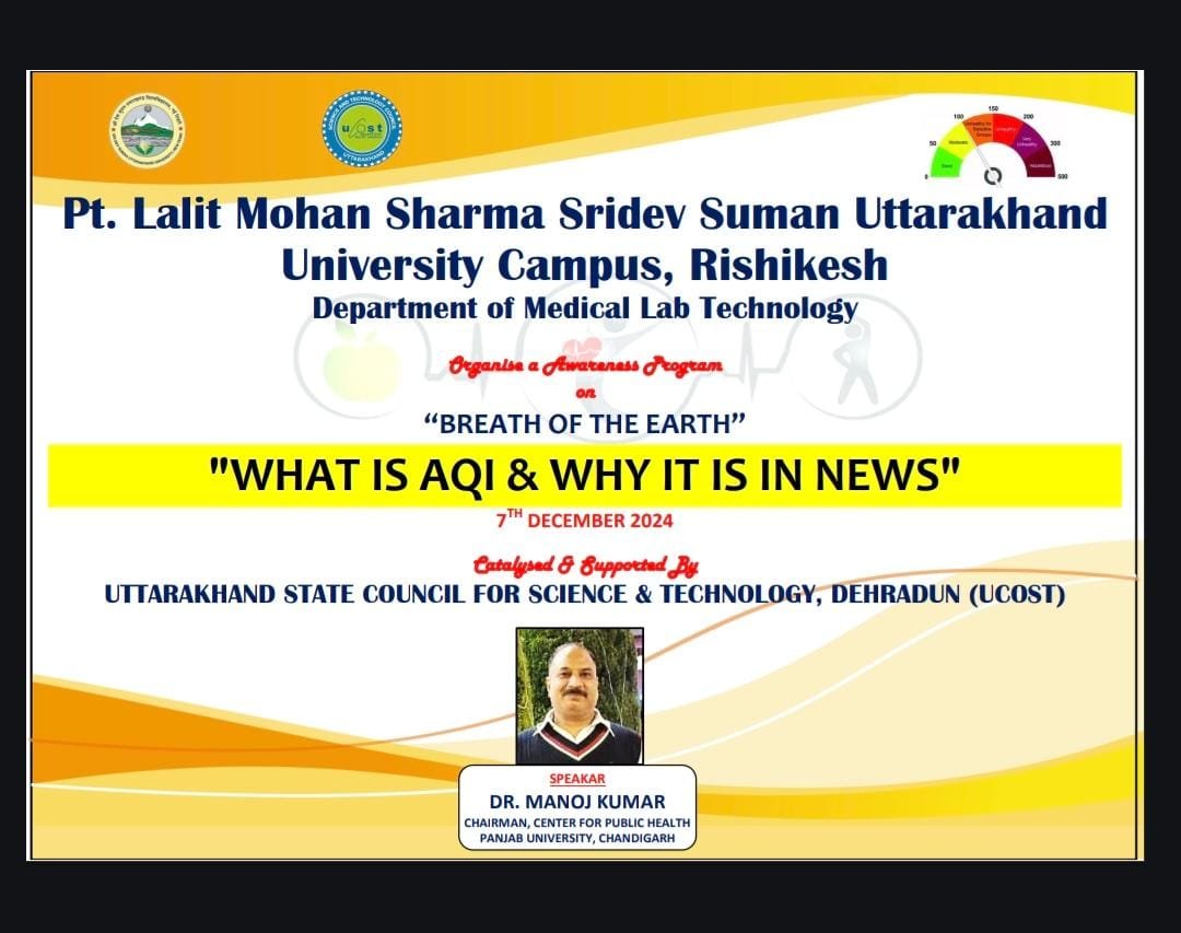 ऋषिकेश : पंडित ललित मोहन शर्मा श्रीदेव सुमन उत्तराखंड विश्वविद्यालय परिसर ऋषिकेश के मेडिकल लैब टेक्नोलॉजी विभाग में उत्तराखंड राज्य विज्ञान एवं प्रौघोगिकी परिषद, देहरादून (UCOST) की ओर से वायु प्रदूषण पर एक जनजागरूकता व्याख्यान का आयोजन किया गया, जिसमे Breath of the Earth, (What is AQI, Why it is in News) विषय पर चर्चा की गई।