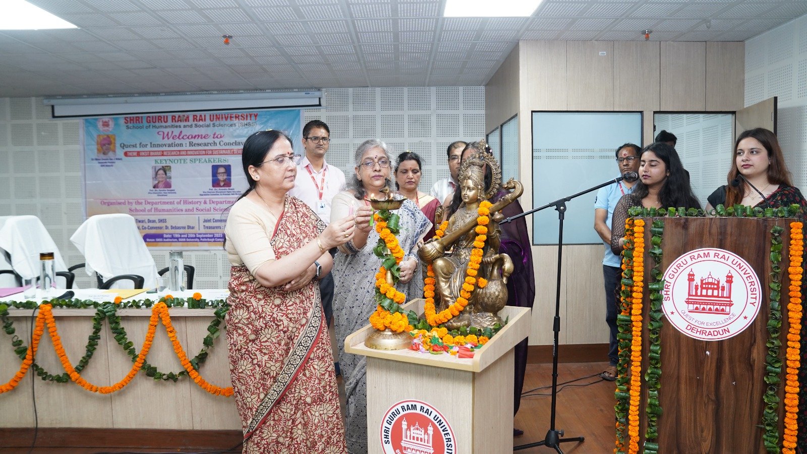 इस अवसर पर श्री गुरु राम राय विश्वविद्यालय के प्रेसिडेंट श्रीमहंत देवेंद्र दास जी महाराज ने स्कूल आफ ह्यूमैनिटीज एंड सोशल साइंस द्वारा आयोजित रिसर्च कान्क्लेव के आयोजकों को शुभकामनाएं प्रेषित की। कॉन्क्लेव का उद्घाटन विश्वविद्यालय की कुलपति प्रोफेसर डॉ कुमुद सकलानी, प्रथम सत्र की अध्यक्ष और मुख्य अतिथि दून विश्वविद्यालय की कुलपति प्रोफेसर डॉ सुरेखा डंगवाल, इन्नोवेशन एंड इनक्यूबेशन सेंटर के निदेशक प्रो. (डॉ.) डी.पी. मैठाणी , डीन प्रो डॉ प्रीति तिवारी और कॉन्क्लेव के संयोजक इतिहास विभाग के विभागाध्यक्ष डॉ सुनील किश्टवाल ने दीप प्रज्वलन करके किया।