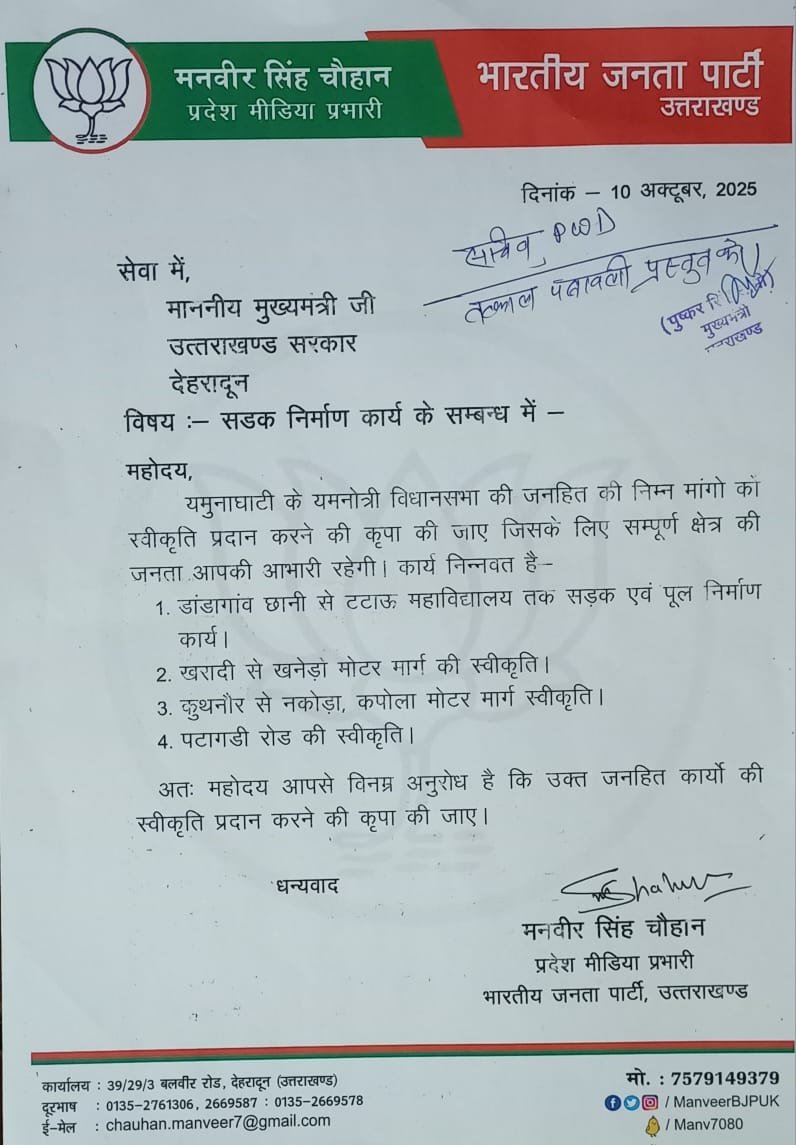 देहरादून। यमुना घाटी स्थित कई गाँवों मे सड़कों के निर्माण की मांग को लेकर भाजपा के प्रदेश मीडिया प्रभारी मनवीर सिंह चौहान ने मुख्यमंत्री पुष्कर सिंह धामी से भेंट की और सड़कों की स्वीकृति की मांग करते हुए ज्ञापन दिया। ज्ञापन मे उन्होंने डांडागांव छानी से टटाऊ महाविद्यालय तक सड़क एवं पूल निर्माण कार्य, खरादी से खनेड़ो मोटर मार्ग की स्वीकृति, कुथनौर से नकोड़ा, कपोला मोटर मार्ग स्वीकृति तथा पटागडी रोड की स्वीकृति की मांग की।