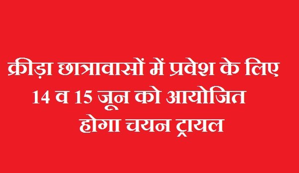 कोटद्वार। खेल विभाग उत्तराखंड के अधीन संचालित बालक और बालिका आवासीय क्रीड़ा छात्रावासों में प्रवेश के लिए चयन ट्रायल 14 व 15 जून को आयोजित किया जायेगा। राजकीय स्पोर्ट्स स्टेडियम कोटद्वार के प्रभारी श्याम सिंह डांगी ने जानकारी देते हुए बताया कि 14 व 15 जून को कोटद्वार स्थित राजकीय स्पोर्ट्स स्टेडियम और पौड़ी स्थित रांसी स्टेडियम में चयन ट्रायल होगा। बताया कि कोटद्वार स्टेडियम में बालक व बालिका वर्ग की बाक्सिंग, बालिका वर्ग की हॉकी और बालक वर्ग में वॉलीबाल का चयन ट्रायल होगा। वहीं पौड़ी के रांसी स्टेडियम में बालक व बालिका वर्ग के फुटबाल, एथलेटिक्स और बैडमिंटन सहित क्रिकेट का चयन ट्रायल होगा। ट्रायल में भाग लेने हेतु आयु प्रमाण पत्र, स्थाई निवास प्रमाण पत्र व मेडिकल फिटनेस प्रमाण पत्र लाना अनिवार्य है।
