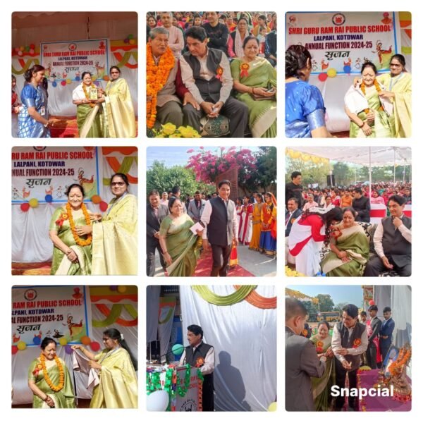 कोटद्वार। श्री गुरु राम राय पब्लिक स्कूल, लालपानी में वार्षिक उत्सव के अवसर पर छात्रों, शिक्षकों और अभिभावकों ने एक भव्य आयोजन किया। इस कार्यक्रम में उत्तराखंड के पूर्व मुख्यमंत्री हरीश रावत, पूर्व कैबिनेट मंत्री सुरेन्द्र सिंह नेगी तथा कोटद्वार नगर निगम की प्रथम महिला महापौर हेमलता नेगी मुख्य अतिथि के रूप में उपस्थित रहे। कार्यक्रम की शुरुआत अतिथियों द्वारा दीप प्रज्वलित कर की गई, तत्पश्चात छात्र-छात्राओं के रंगारंग सांस्कृतिक प्रस्तुतियों ने दर्शकों का मन मोह लिया। छात्रों और अभिभावकों ने अतिथियों का भव्य स्वागत किया।