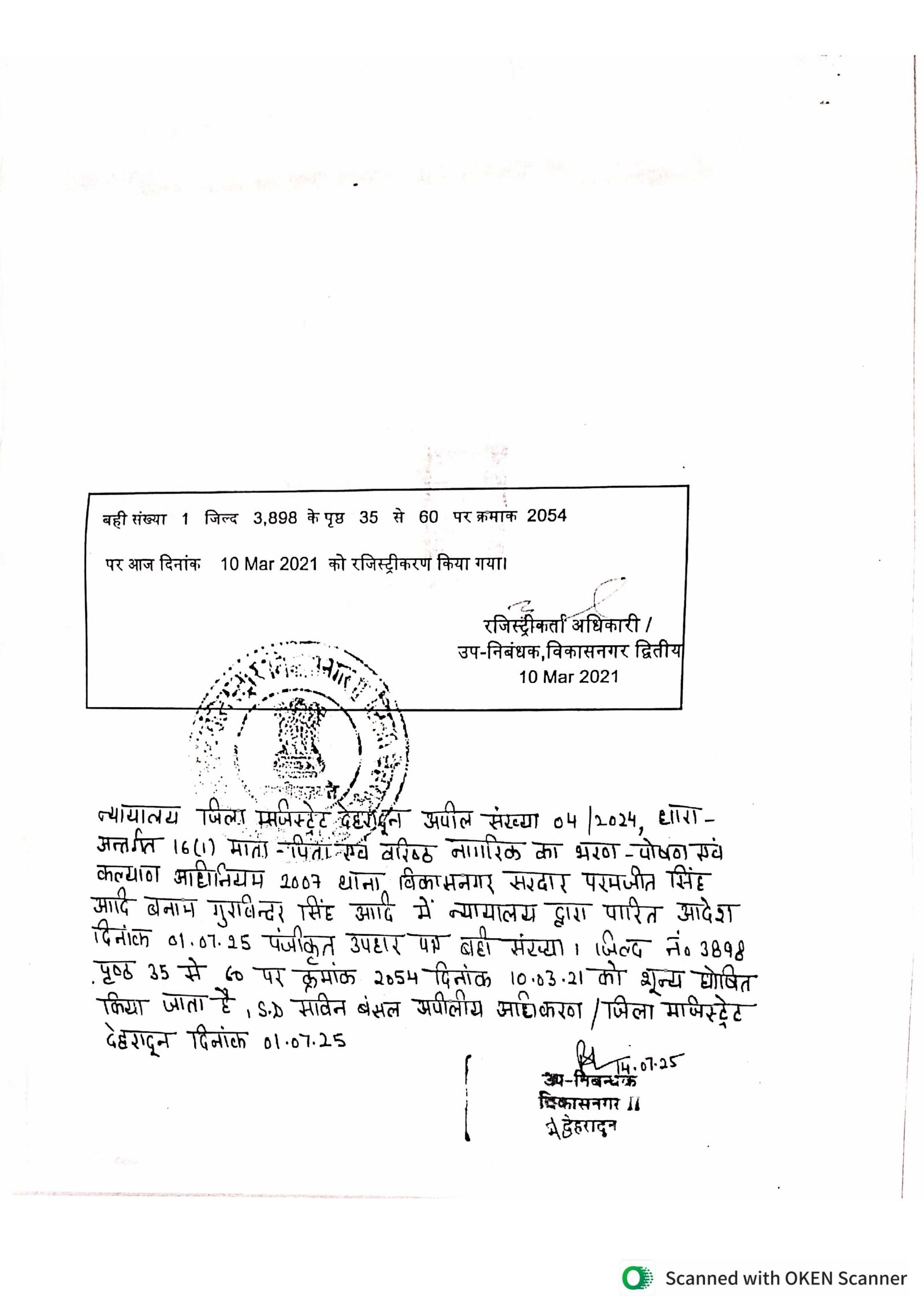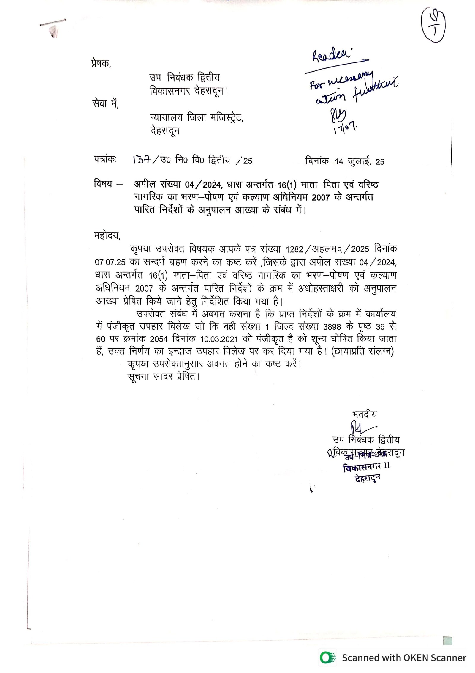 देहरादून : विगत दिवस डीएम ने बुजुर्ग दम्पति जिनके बेटे ने गिफ्ट डीड में सम्पति अपने नाम करवाकर बुजुर्ग माता-पिता को घर से बाहर कर दिया था। जिस डीएम ने अपने न्यायालय में पहली सुनवाई में ही गिफ्ट डीएड रद्द कर दी थी, डीएम ने आदेशों के अनुपालन में रजिस्ट्री अनुपालन ओदश पास किया है। जिला प्रशासन देहरादून सामाजिक कर्तव्य से विमुख लोगों को अपनी न्याय प्रणाली से रास्ता दिखा रहा है वहीं असहाय जरूरतमंद लोंगों को त्वरित न्याय मिल रहा है। जिलाधिकारी सविन बसंल की कार्यप्रणाली सदैव असहाय, बुजुर्ग, महिला बच्चों, जनमानस के हित में रही है। असहाय जरूरतमंदो से जुड़े विषयों पर जिला प्रशासन द्वारा सक्रिय होकर त्वरित निर्णय लिए जा रहे हैं, जिससे जनमानस के प्रति जिला प्रशासन की प्रतिबद्धता कर्तव्यनिष्ठा दर्शाता है।