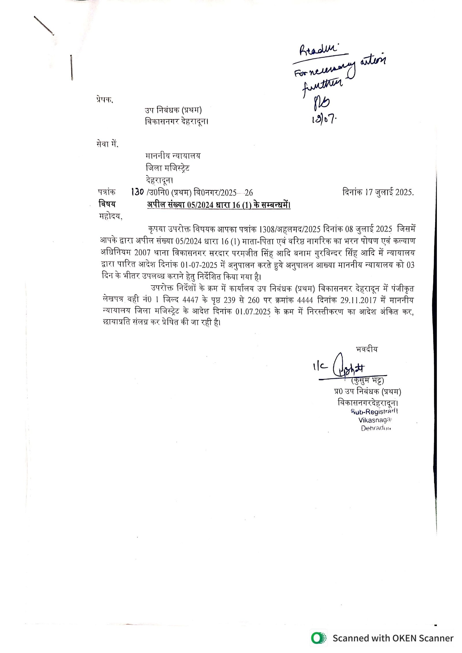- डीएम के आदेशानुसार रजिस्ट्री आफिस से अनुपालन किया गया पेश