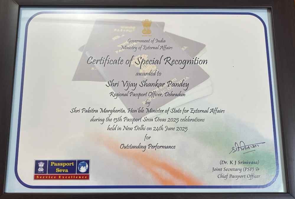 क्षेत्रीय पासपोर्ट अधिकारी देहरादून विजय शंकर पांडेय को उत्कृष्ट प्रदर्शन के लिए विशेष मान्यता पुरस्कार