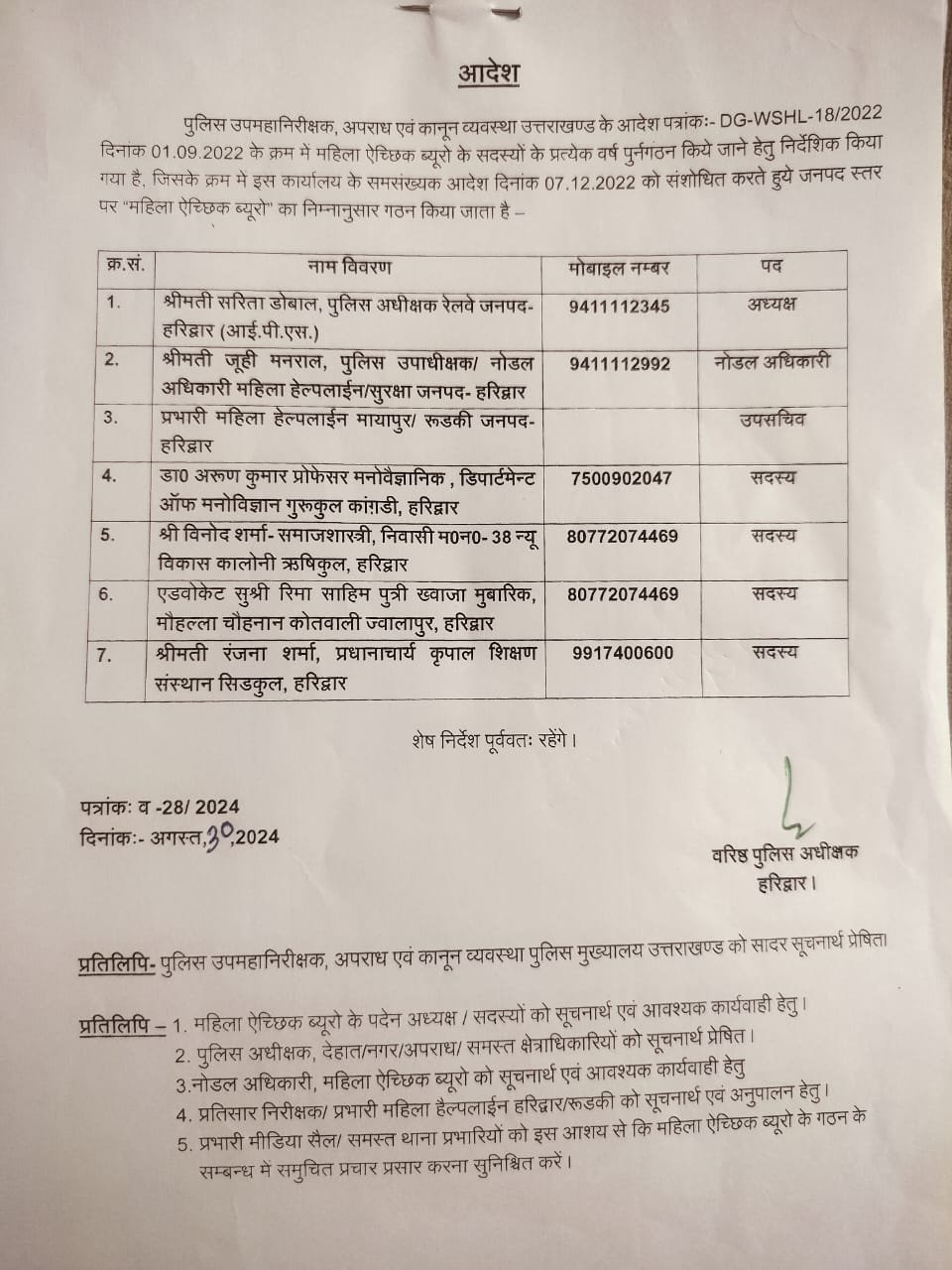 महिला ऐच्छिक ब्यूरों में एसपी जीआरपी सरिता डोबाल को अध्यक्ष, सीओ सिटी जूही मनराल नोडल अधिकारी बनाया गया है। जिसमें महिला हेल्पलाइन प्रभारी को उप सचिव बनाया गया है। महिला ऐच्छिक ब्यूरों में गुरुकुल कांगड़ी विश्वविद्यालय के मनोविज्ञान विभाग के डॉक्टर अरुण शर्मा, समाजशास्त्री विनोद शर्मा, एडवोकेट रीमा शाहिम व कृपाल शिक्षण संस्थान की प्रधानाचार्य रंजना शर्मा को सदस्य बनाया गया है।